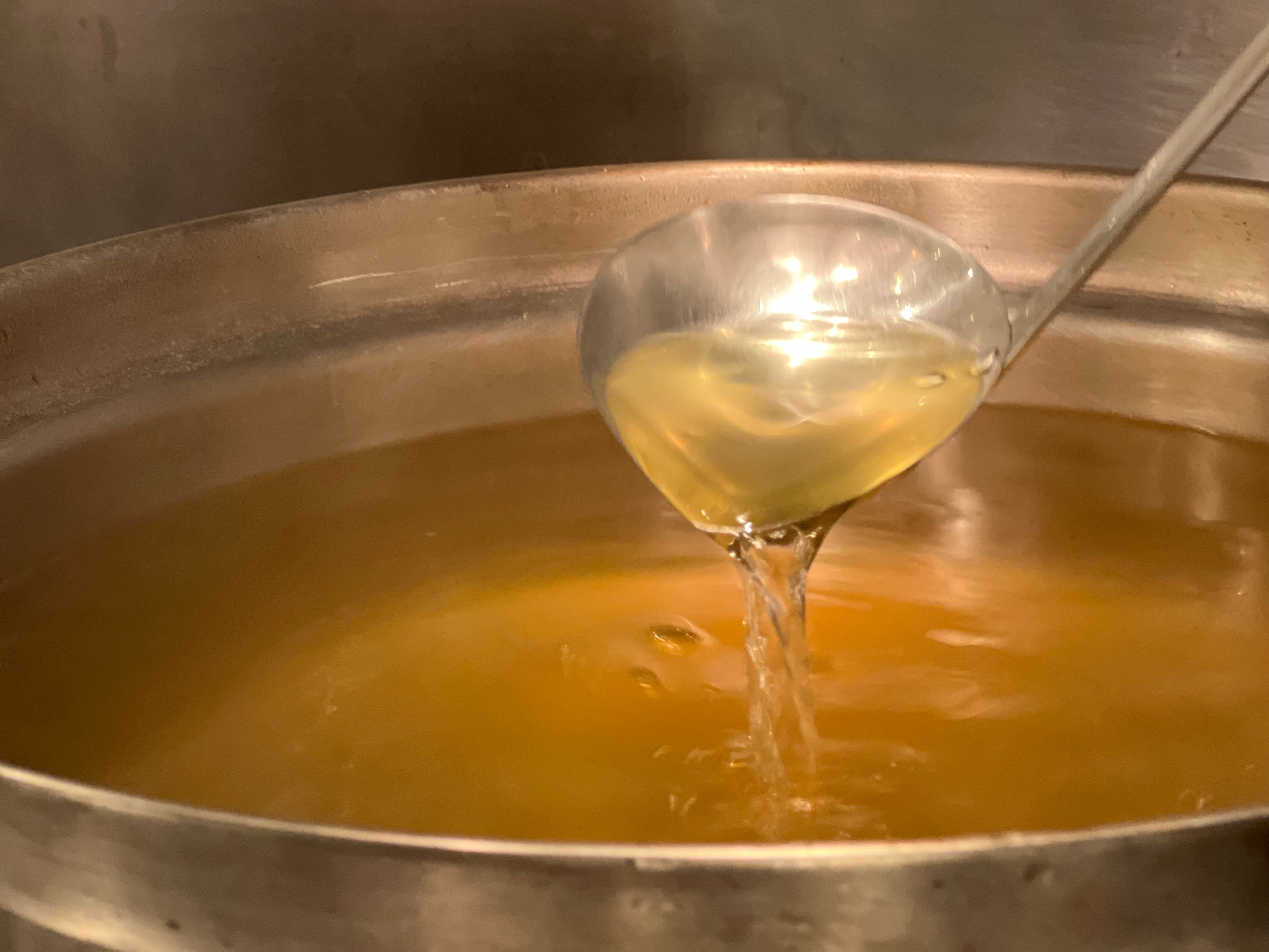 専用のそば押し出し機を使用することで、摩擦を抑えた製麺が可能になり、手打ちでしか製麺できないといわれていた十割蕎麦のコシと柔らかさの両立を実現しました。本ガツオに甘味のあるサバ節とコクのあるイワシ節でとった出汁はクセが少なく、しっかりとした風味を持ちます。