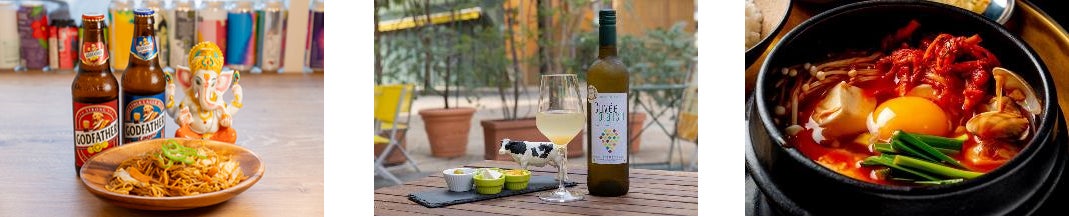 中央:La Petite Fromagerie~小さなチーズの店~「もものスパークリングワイン」(500円)川崎で人気のチーズ屋さんが選んだ、チーズと相性抜群のもものスパークリングワインをお楽しみください!