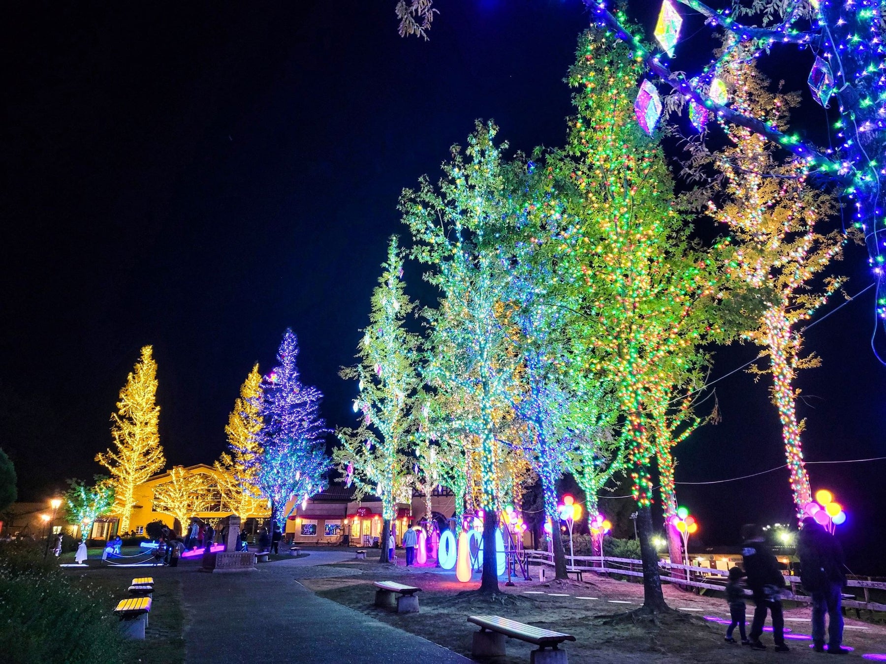 道の両側にある樹木には、可愛らしいキャンディのイルミネーションが輝いています。カラフルなキャンディのイルミネーションロードをお楽しみください。