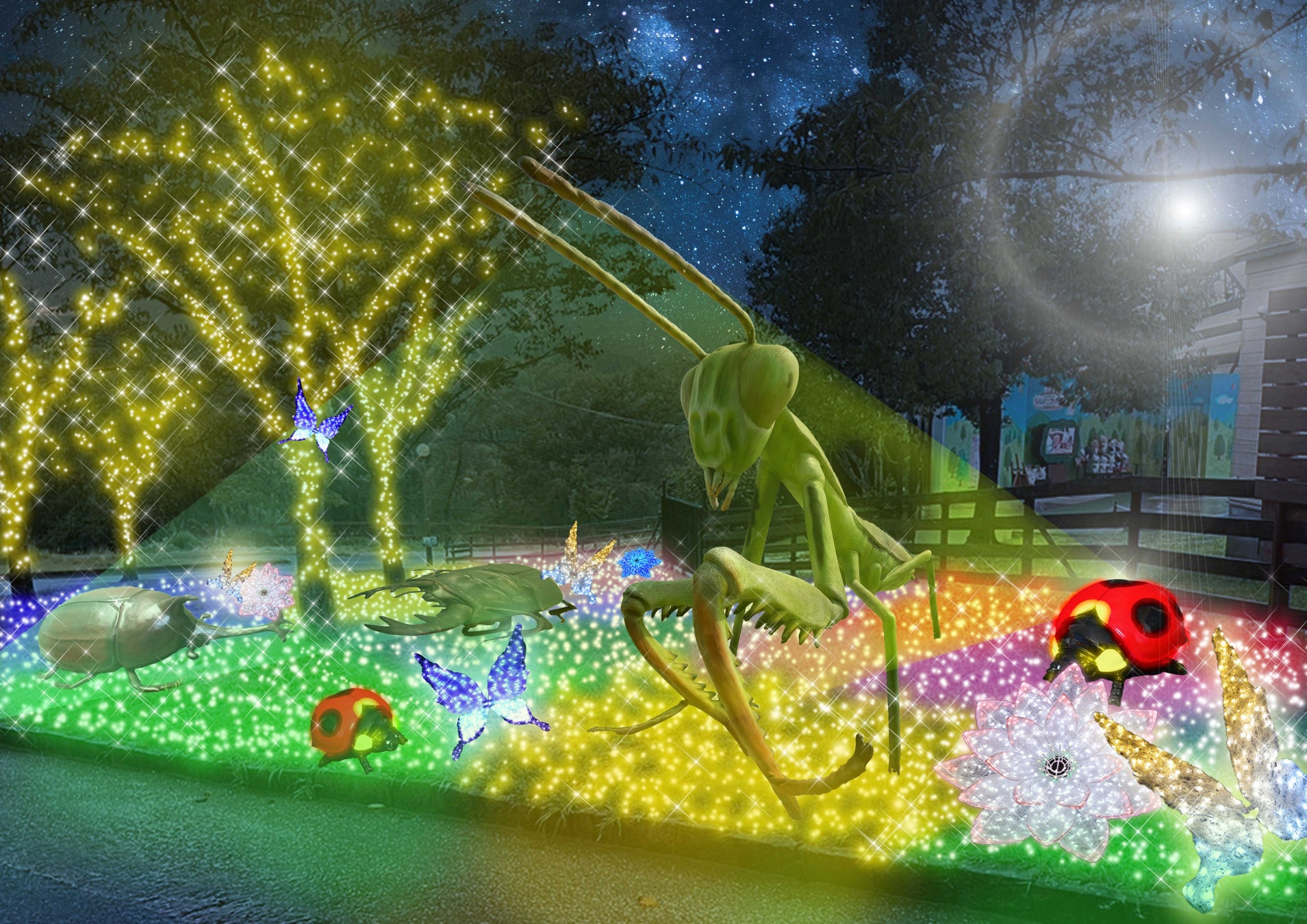 色とりどりに光るイルミネーションの林に、カブトムシやカマキリなど動く巨大な「昆虫ロボット」が生息しています。スポットライトに照らされて煌めく姿は神秘的ですらあります。