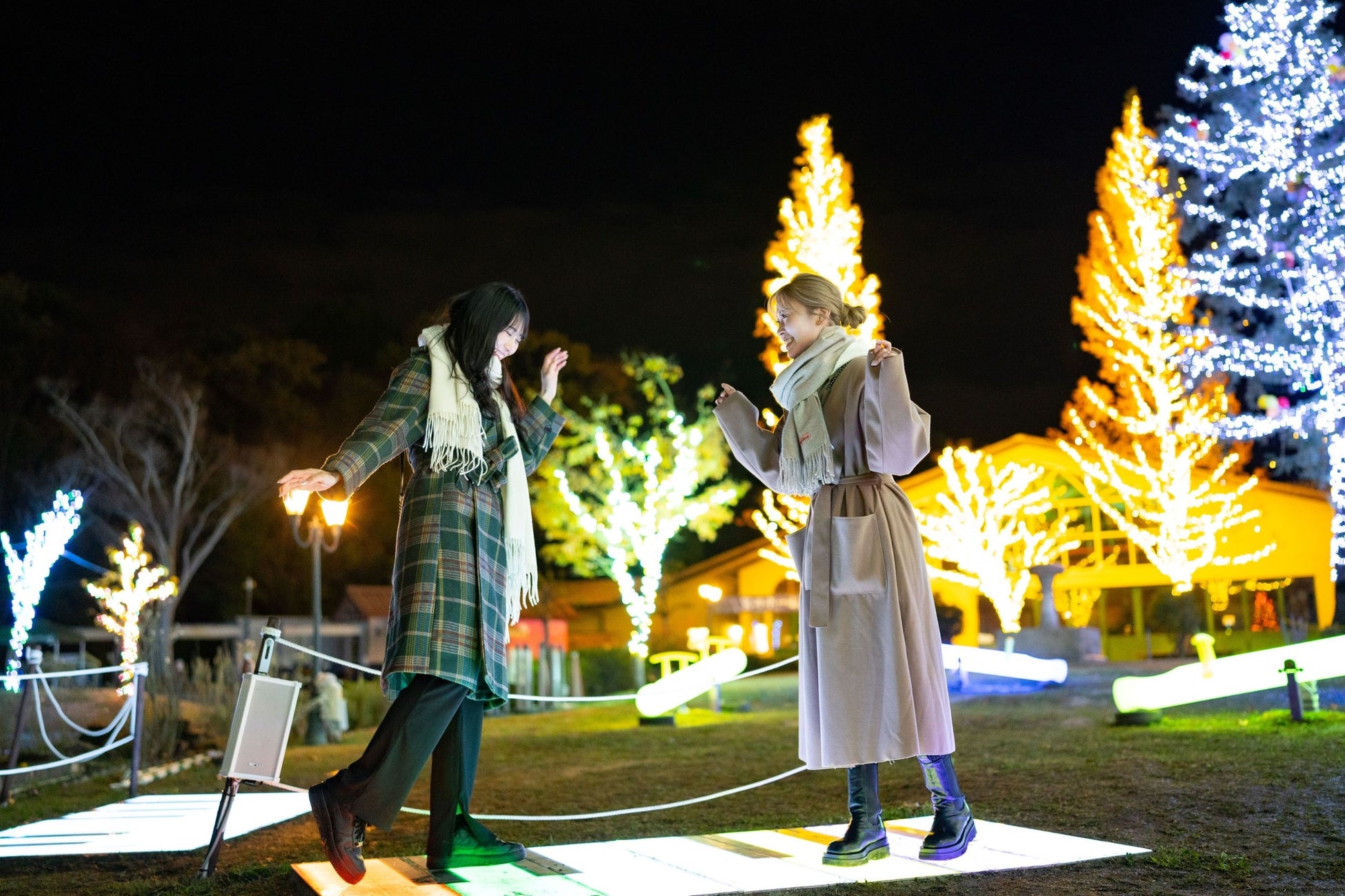 20m級のセコイアの木々がイルミネーションで光輝き、その木の下には光るシーソーや椅子、音がなる道があり、光と音の体験ができます。お子様も楽しめて大人気のエリアです。