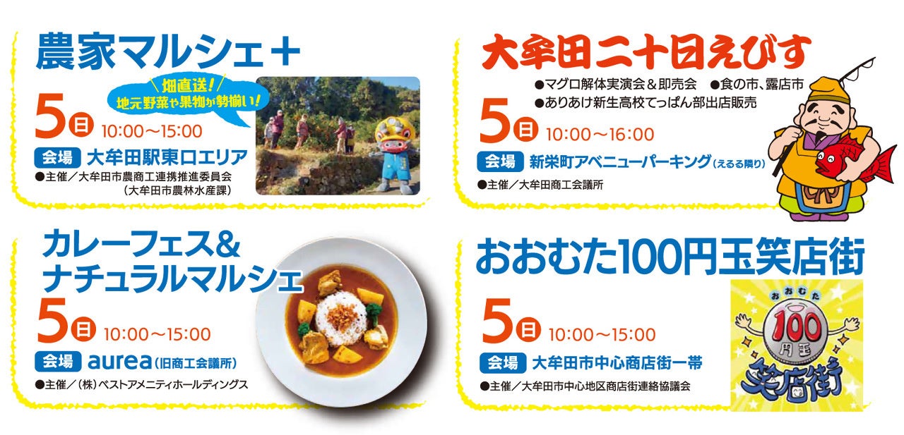 毎年恒例のイベント「おおむた二十日えびす」やお店自慢の商品やお買い得商品を100円で提供する「おおむた100円玉笑店街」も同日に開催で、とにかくまちなかが盛り上がる2日間です!