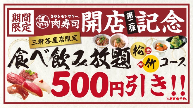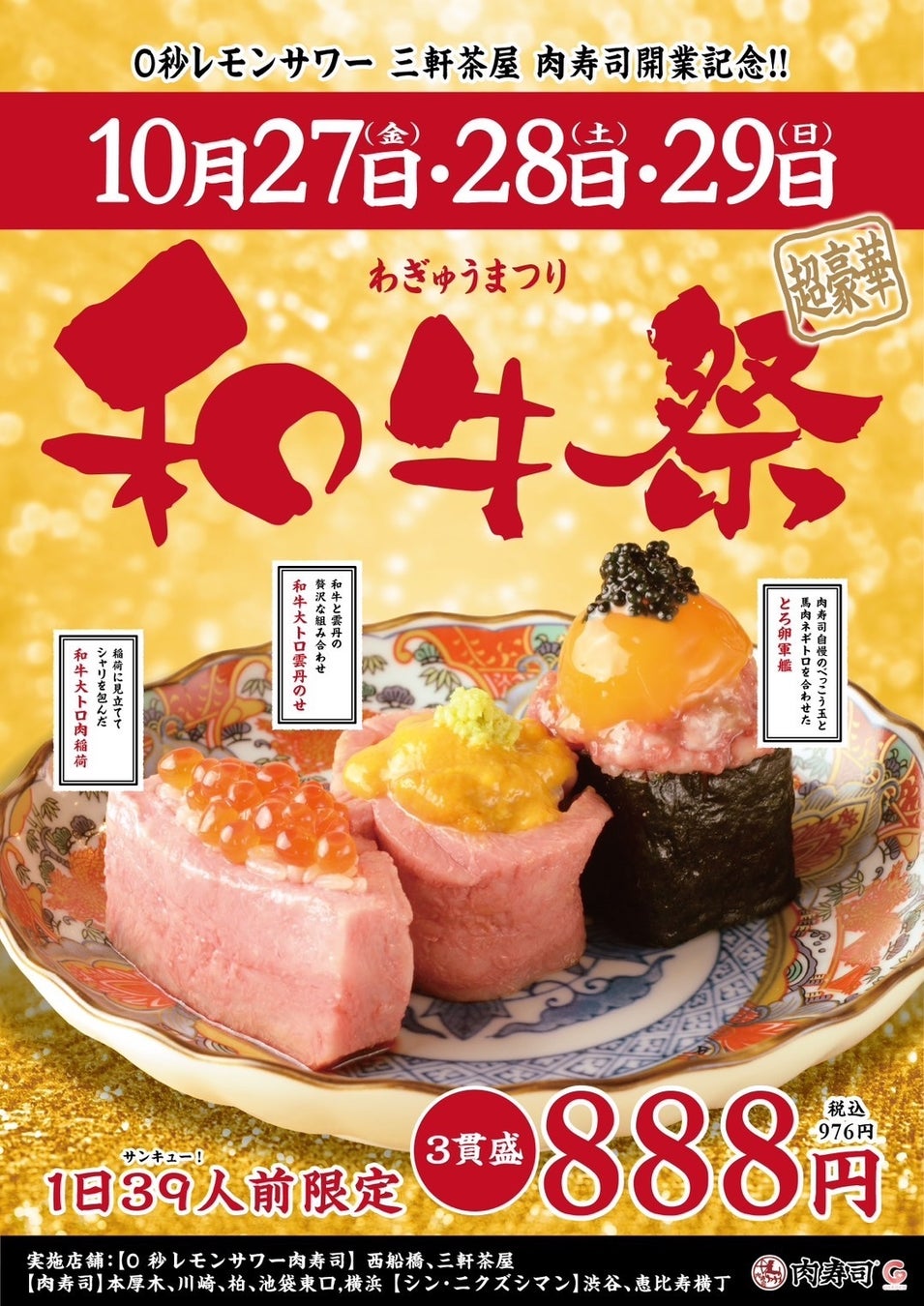 「肉寿司」と「0 秒レモンサワー」のコラボ店舗を3店舗連続オープンしたことを記念して、キャンペーン実施店舗※ にご来店のお客様を対象に「超豪華和牛祭」を開催いたします。「超豪華和牛祭」では、1 日 39 人前限定でトロ肉 をふんだんに使った肉寿司 3 貫盛を、税込 976 円(税抜 888 円)でご提供いたします。
