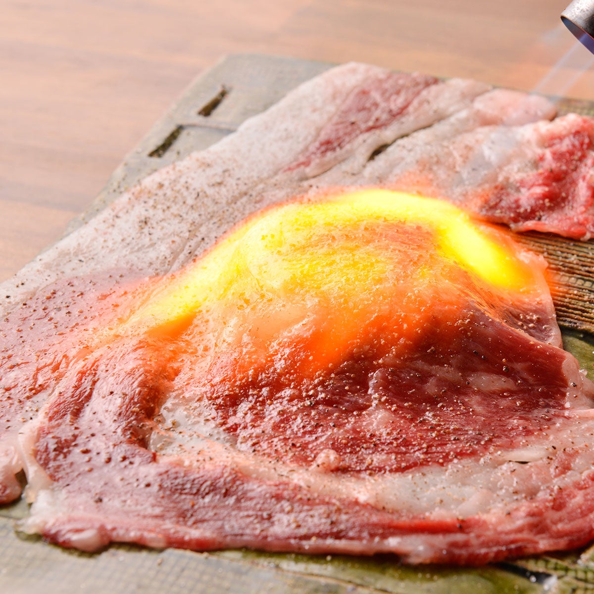 これを食べねば肉寿司は語れない!!当店の名物「さしとろ」国産牛のリブロースを贅沢に1枚使用!!拘りの岩塩とペッパーで味付け豪快に炙る。絶対に損はさせません!!(※一貫)