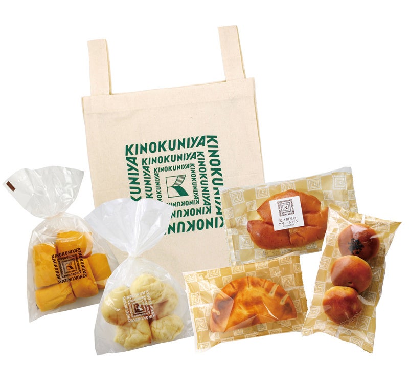 セット内容:国産かぼちゃのもちもちパン、ポンデケージョ風チーズパン、シナモンアップル、紀ノ国屋のクリームパン、秋のあんぱんセット、コットンバッグ