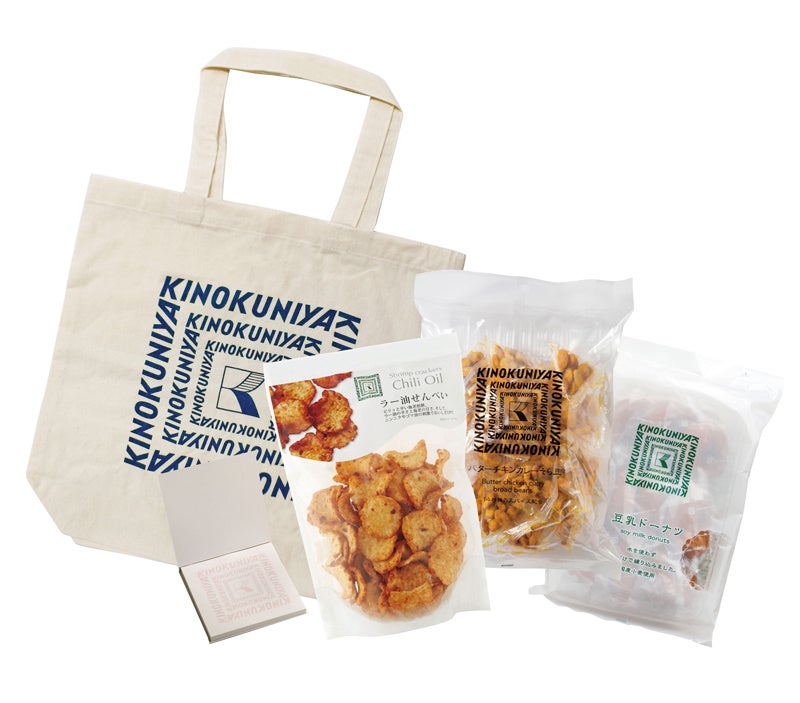 セット内容:ラー油せんべい/バターチキンカレーそら豆/豆乳ドーナツ/付箋/コットントートバッグ(ブルー)