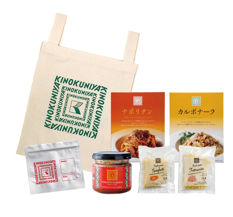 セット内容:ナポリタン、カルボナーラ、トマトハリッサ、生パスタスパゲッティ、生パスタフィットチーネ、コットンバッグ、アルミチャック袋3枚入