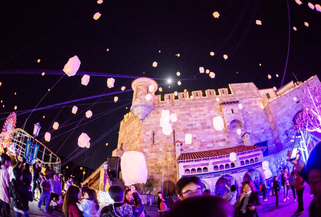 お城を背景に、冬の夜空に無数のランタンが浮かぶ、まるで夢の世界。
