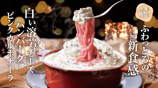 SNSで大バズリ中!話題の溶岩パスタに、雪のようなふわっとろホイップがとろける『白い溶岩チーズハンバーグ ピンクカルボナーラ』が11月1日(水)より冬限定で新登場!