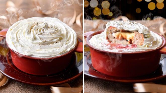 冬の真っ白い雪をイメージしたふわとろホイップの中には、ぎゅっと肉肉しい「肉厚チーズインハンバーグ」と”ビーツ”を使用したピンク色の「カルボナーラ」が隠れた遊び心満載の一品。余熱で程よくとろけていくホイップに肉の旨味、卵黄とチーズの濃厚カルボナーラが三位一体となった、あっと驚く新感覚の美味しさです!