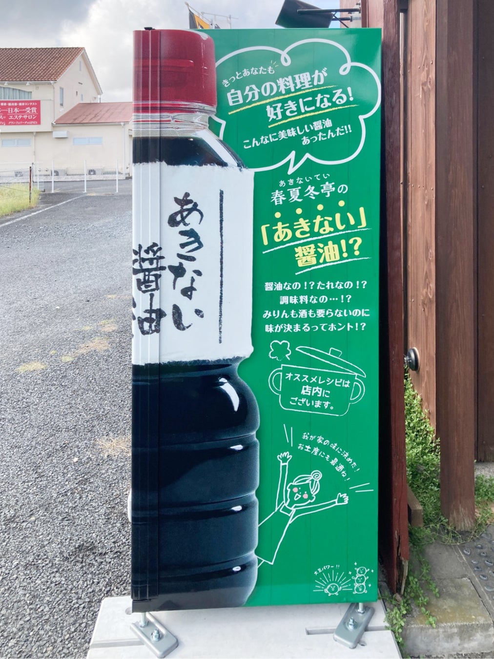 特徴的な緑色をベースとしたこの自販機は、春夏冬亭様のイメージカラーを反映させており、「あきない醤油」の商品写真を大胆に配置したデザインが目を引きます。