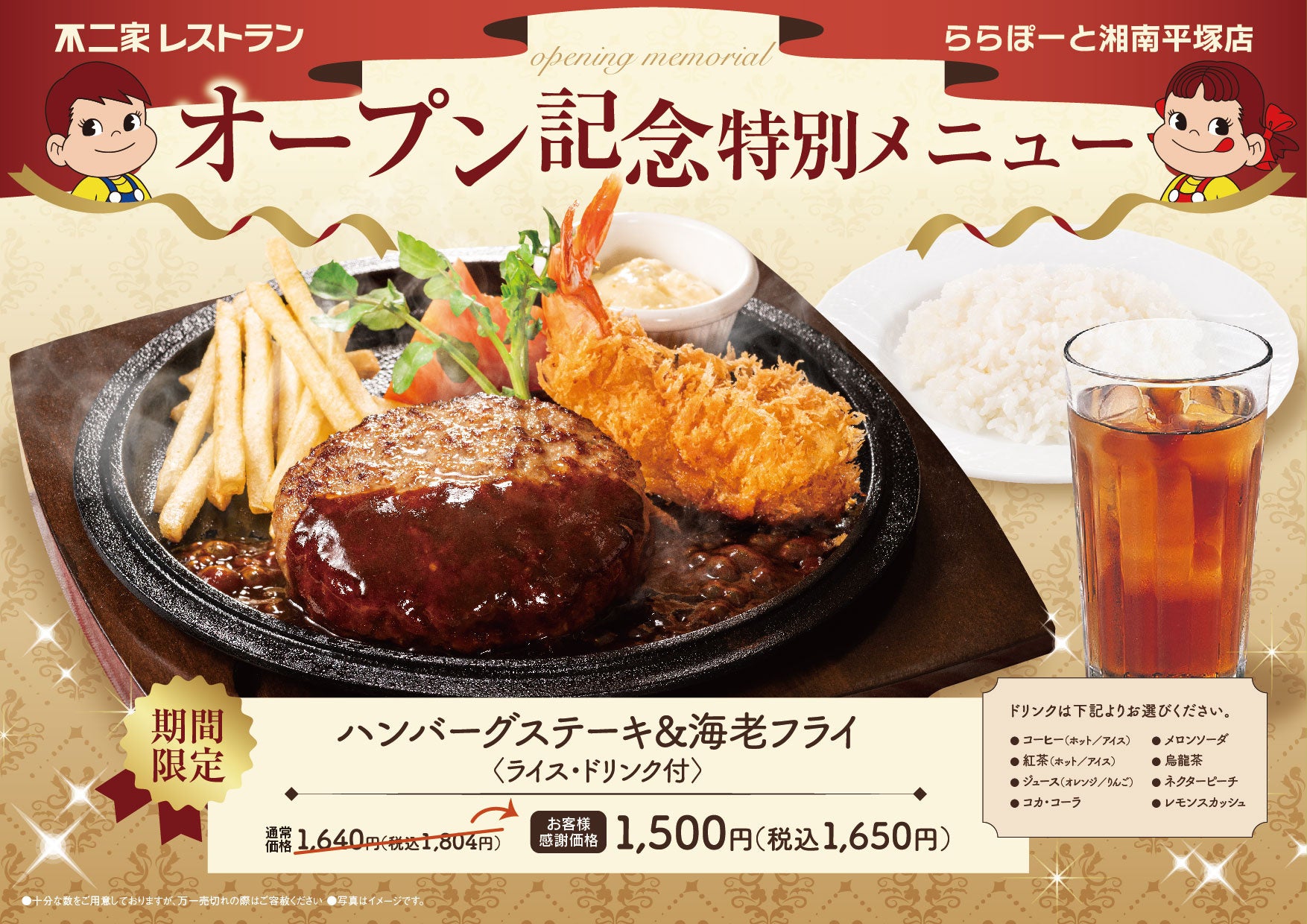 オープンを記念して、不二家レストランの定番人気メニュー「ハンバーグステーキ&海老フライ<ライス・ドリンク付き>」を特別価格でご提供します。