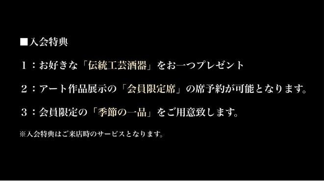 会員制度は、「伝統工芸酒器」のプレゼントや会員限定のおもてなし等の特典を多数ご用意。アート作品展示の「会員限定席」の席予約も会員様のみのサービスとなります。