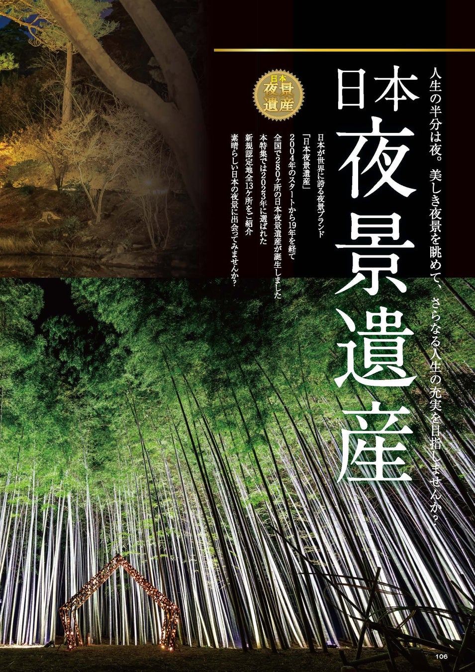 全国的に知名度の高いあしかがフラワーパーク、ハウステンボス、江の島 湘南の宝石など、作り手による見どころ話しを交えた感動イルミネーション完全ガイドを中心に、注目の光エンタテインメント、全国イルミネーションスポットカタログなど、今シーズン必見のイルミネーションを多面的に深掘り。ほか日本夜景遺産、日本百名月といった夜の絶景シーンもたっぷりご紹介します。