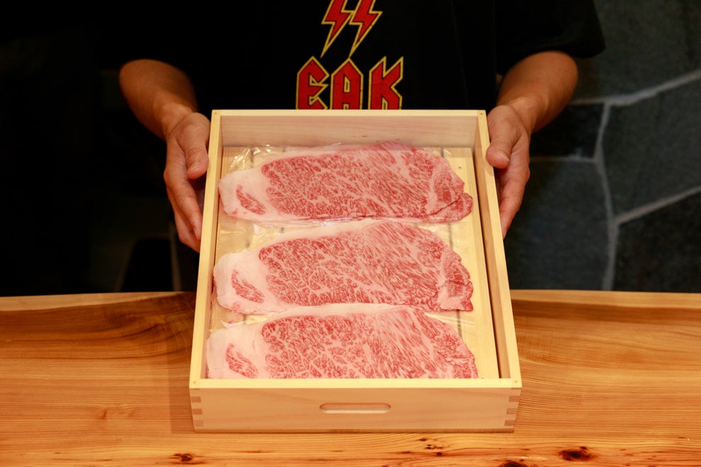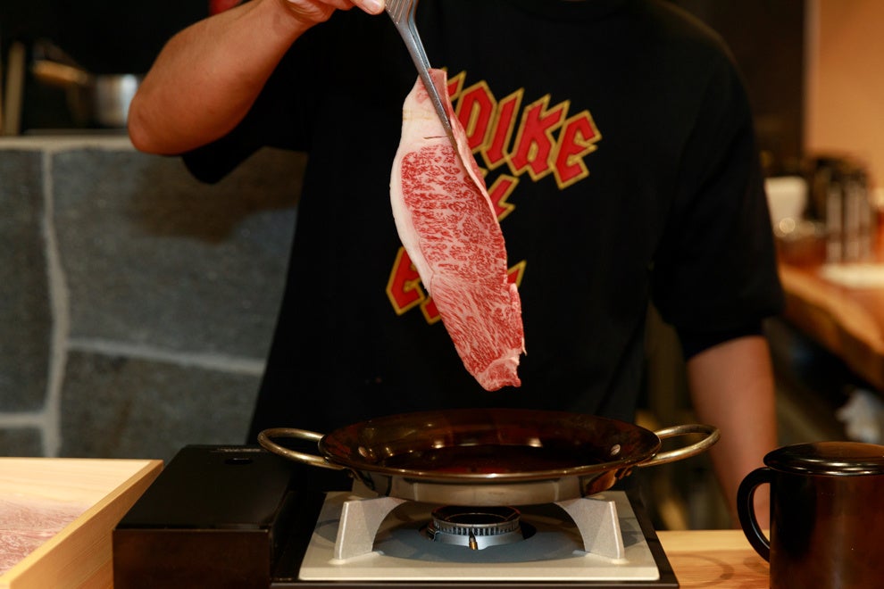 さらに「あいだや」では、もう1つの看板メニューでもある「黒毛和牛サーロインご飯」も提供いたします。広いカウンターを活かし、お客様の目の前で1枚ずつ丁寧にすき焼きスタイルで火入れを行います。焼肉のもみだれからインスパイヤされたタレと卵をたっぷりとつけてご飯と一緒にお召し上がりください。