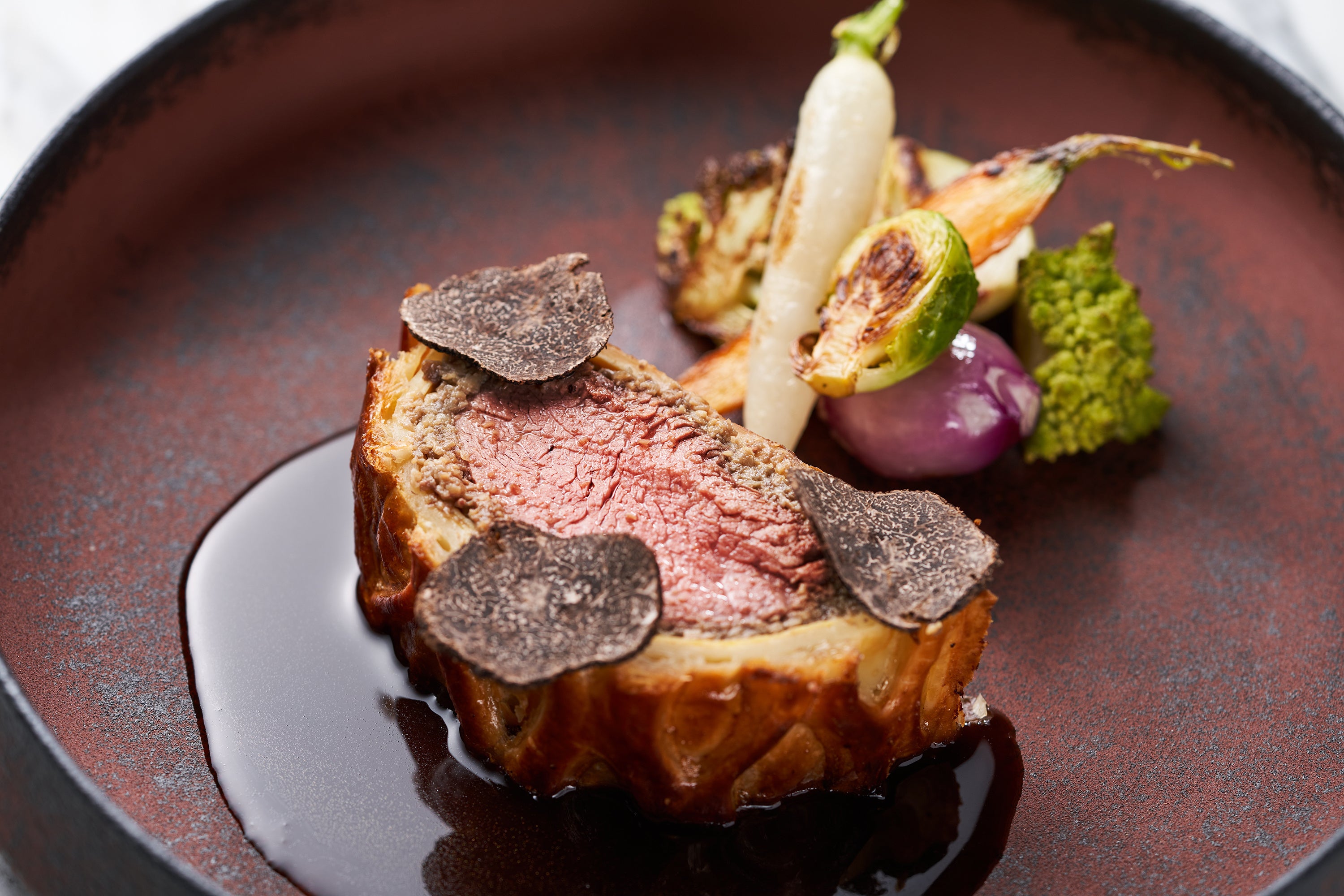 メインはイギリスの伝統料理ビーフ・ウェリントン。徳島県産黒毛和牛「阿波牛」のフィレ肉にマッシュルームのデュクセルを纏わせ、パイ生地で包んで焼き上げました。