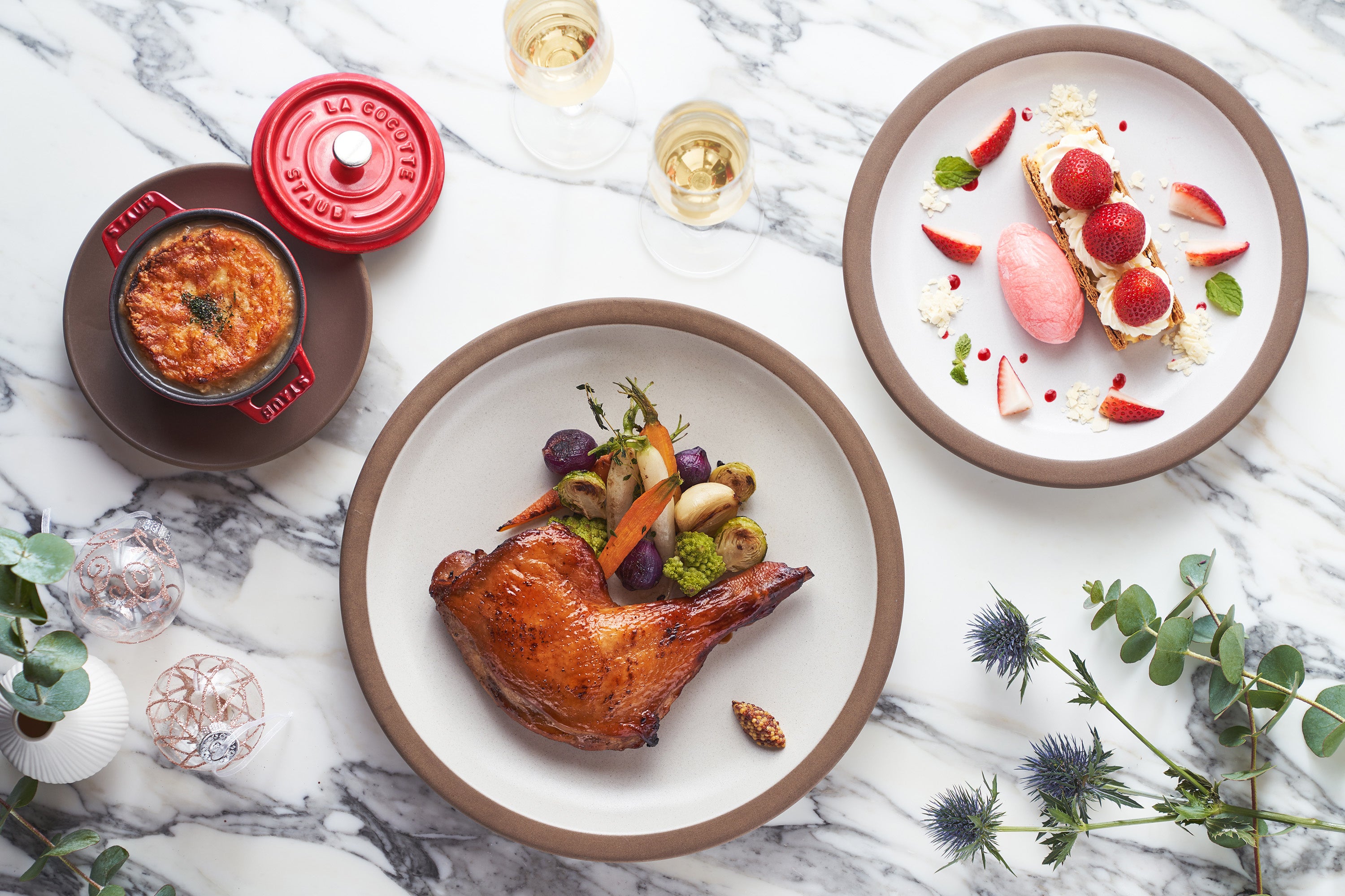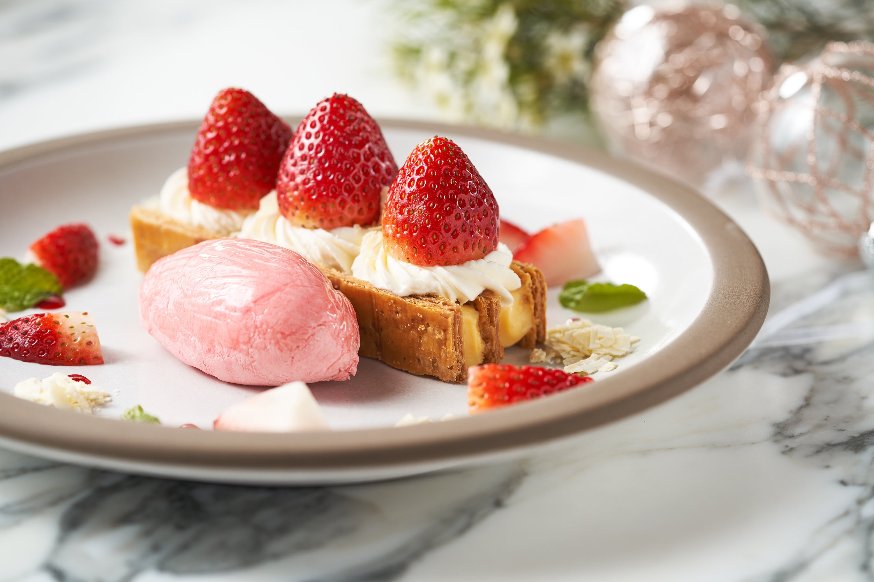 1階『DEK KITCHEN』では、玉ねぎ本来の甘さを最大限に引き出した「オニオングラタンスープ」や、クリスマスに欠かせない骨付きチキンを色とりどりの国産野菜と焼き上げた「国産骨付き鶏もも肉と旬野菜のロースト」、厳選した国産いちごと濃厚なバニラクリームの「国産いちごのXmasミルフィーユ」をアラカルトメニューでご用意。