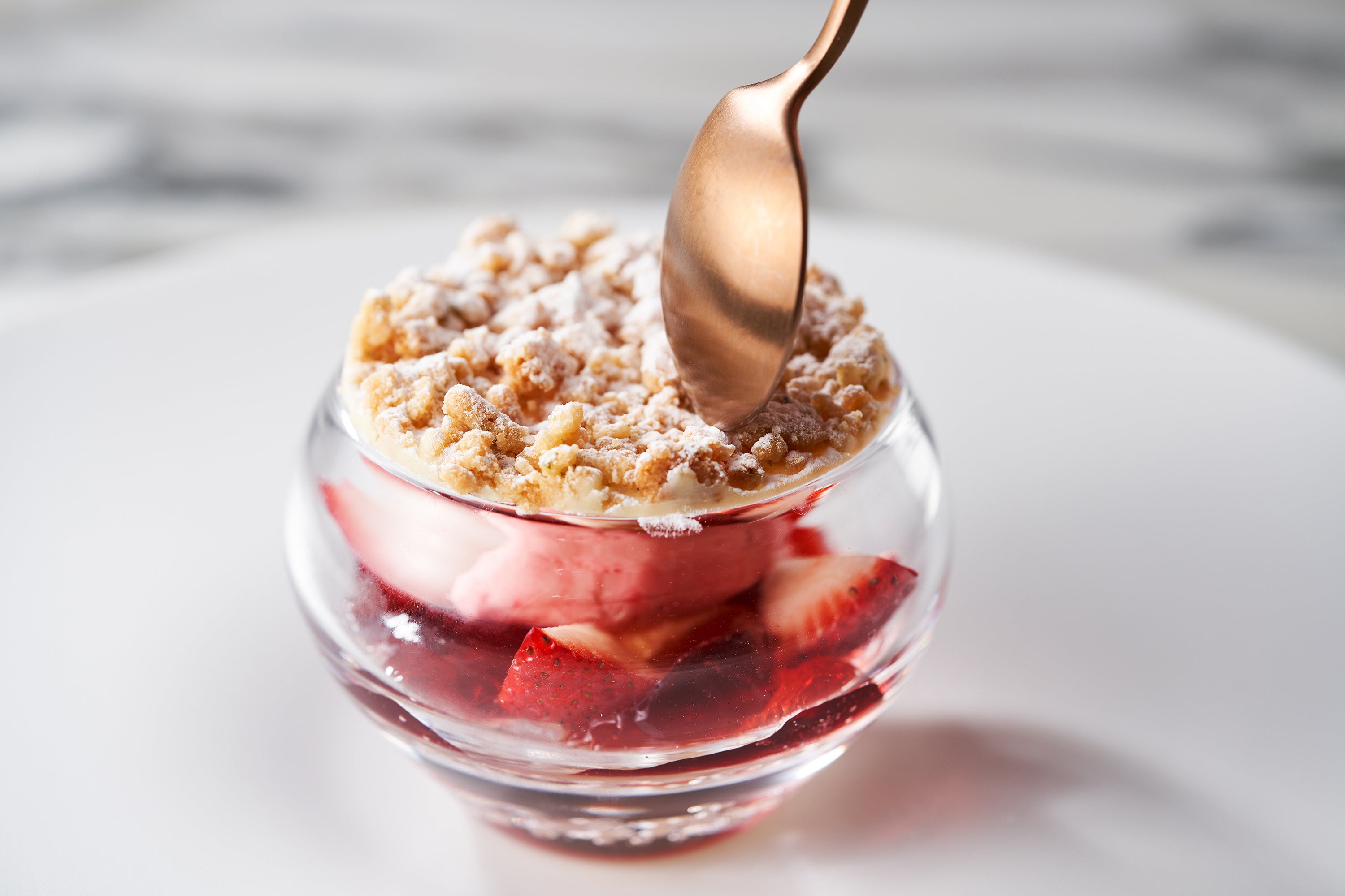 フレッシュいちごに、自家製いちごアイス、いちごのエキスを抽出したいちごジュレをあわせた、いちごの魅力を多彩に楽しめる一品をご用意しました。