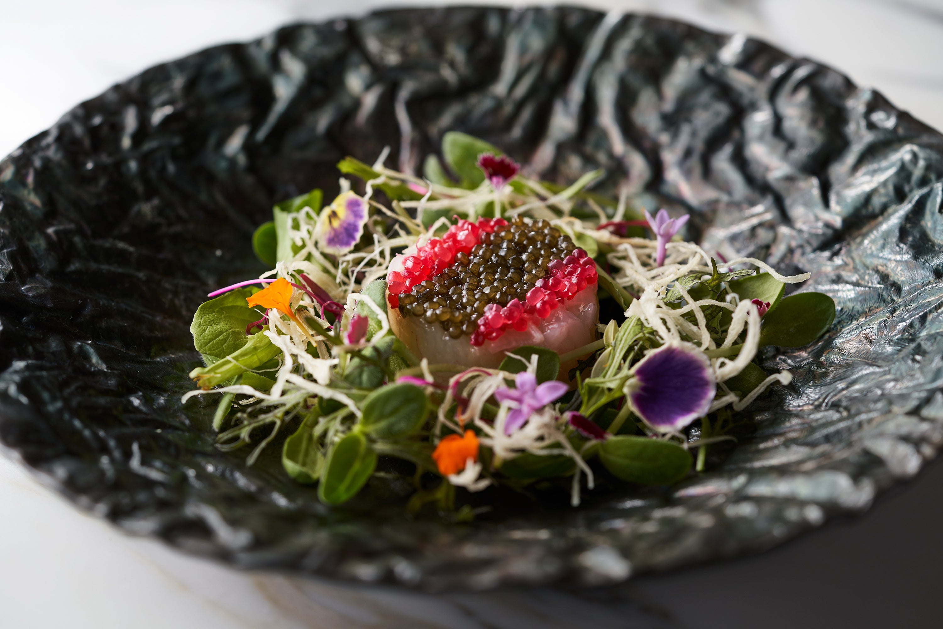 どちらも独特の強い甘みととろけるような口あたりをもつ下仁田葱と白海老に、フィンガーライムの爽やかな酸味と、キャビアの塩味を合わせて、上品な味わいに仕上げました。