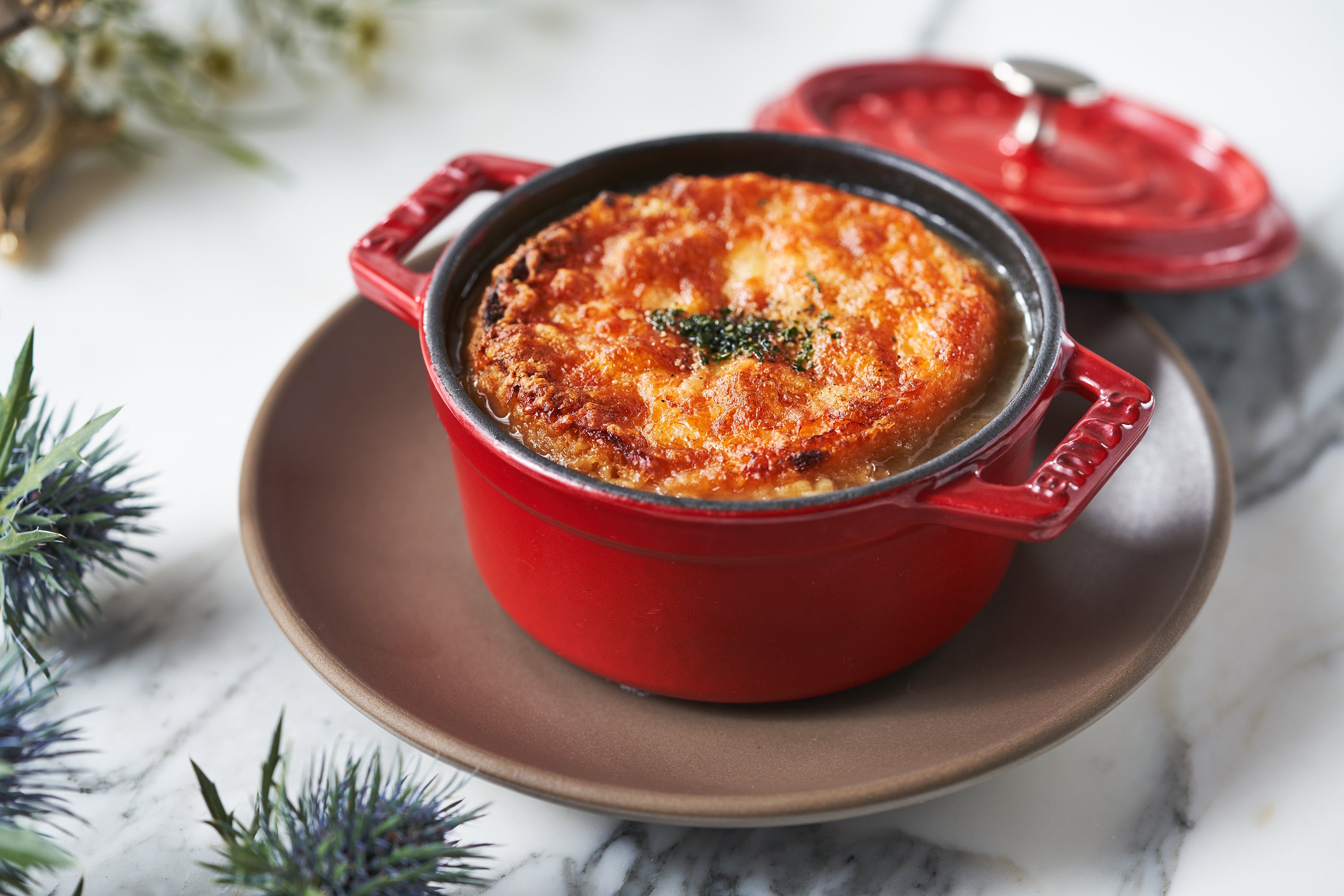 北海道産玉ねぎを時間をかけてじっくりと火を通すことで、玉ねぎの甘みを最大限に引き出したオニオングラタンスープ。