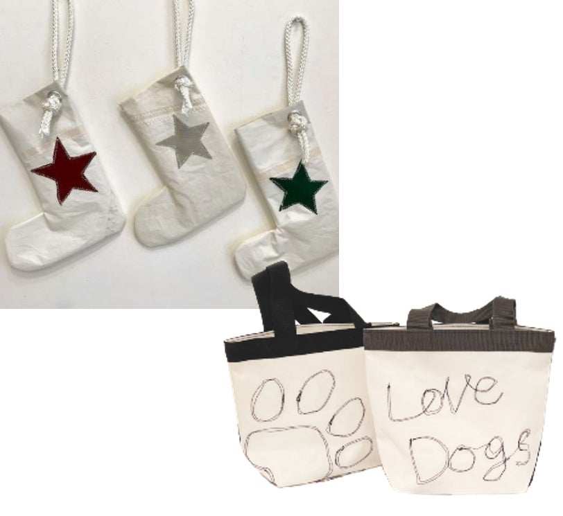 ヨットのセイルで作ったバッグや小物の他にペット用品やクリスマスグッズも多数販売します。