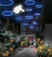 空中に浮かぶバブルリングと共に金網アートのサンタクロースがシュノーケリング姿で空に浮かぶ、まるで海中を散歩しているかのような錯覚に陥るこれまでにない幻想的なイルミネーション。
