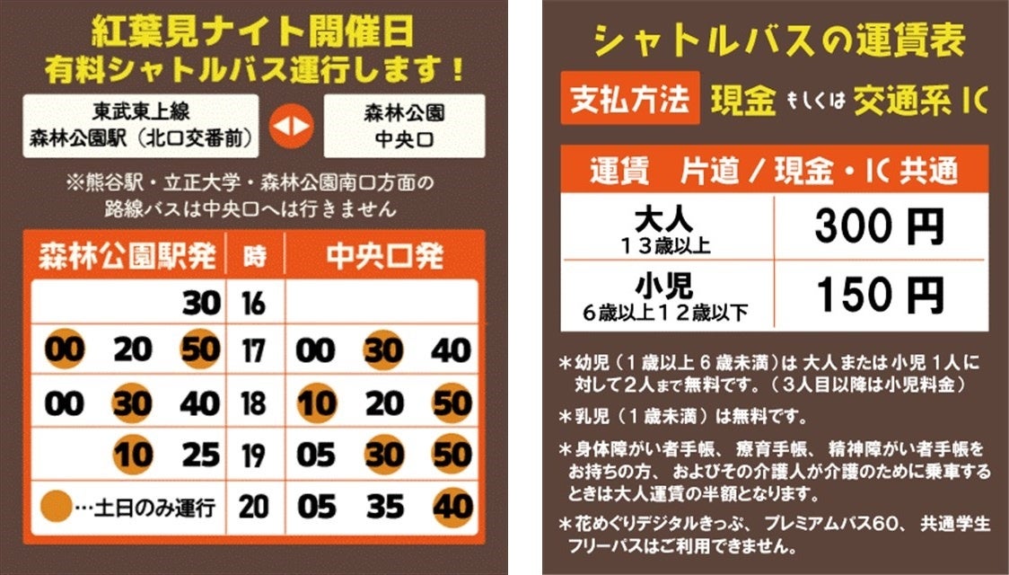 「紅葉見ナイト」開催期間中は、東武東上線「森林公園」駅と、開催会場の中央口を結ぶ、夜間シャトルバスを運行します。公共の交通機関はございませんので、ぜひご利用ください。
