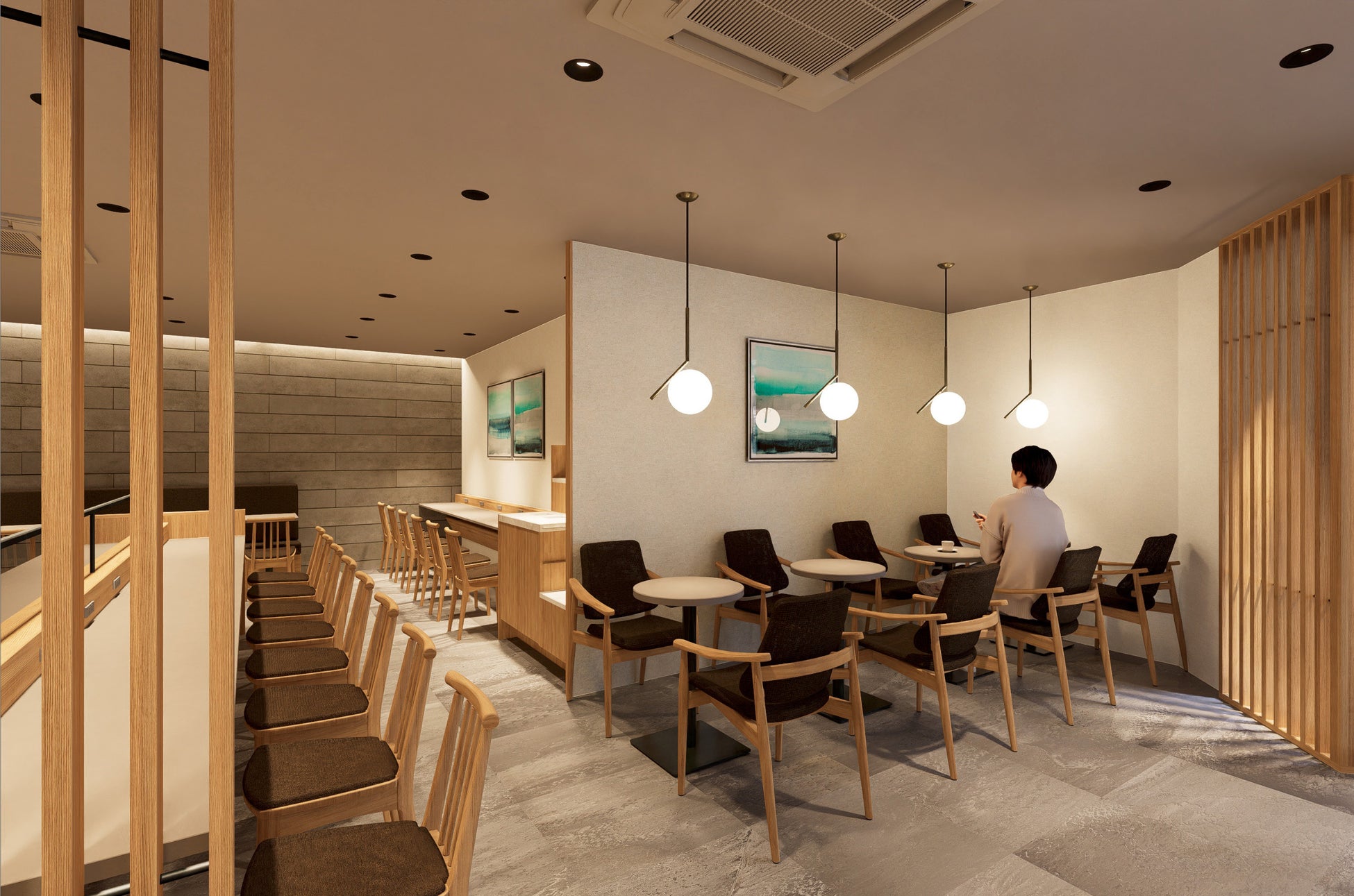 店内は余白である「間(空間)」を大切にし、木素材やアースカラーを使用することで、和の落ち着きと