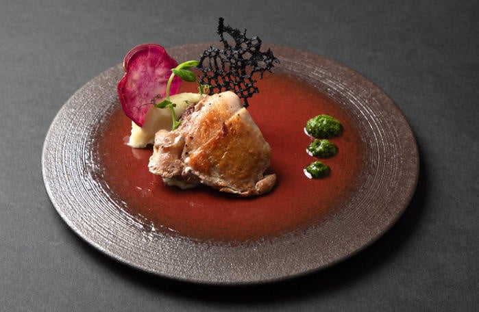 低温でじっくり調理した鶏もも肉のコンフィ。カリッとした皮とジューシーな肉質が特徴です。
