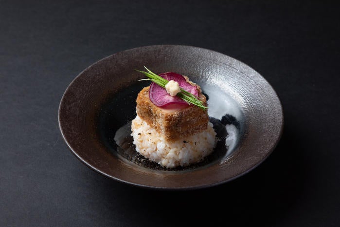 A5ランク黒毛和牛の横濱ビーフを真昆布で締め、炙り仕立てに。昆布の旨味が肉の風味を引き立て、炙ることで香ばしさが加わります。霜降りの柔らかさと昆布の深い味わいが融合した、贅沢な一皿です。