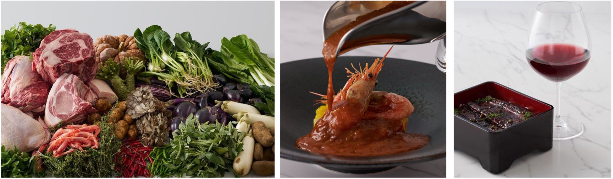 料理に使用する食材は、同氏の生まれ故郷である北海道増毛産の海の幸をはじめとする日本全国で誠実に育まれた魚介類や肉類、そして東京に暮らしていてもなかなかその真価に気づくことの難しい、伝統的な「江戸東京野菜」の数々。それらを用い、フランス料理のエスプリを感じさせつつも、まったく新しいモダン東京を表現する料理をお届けします。