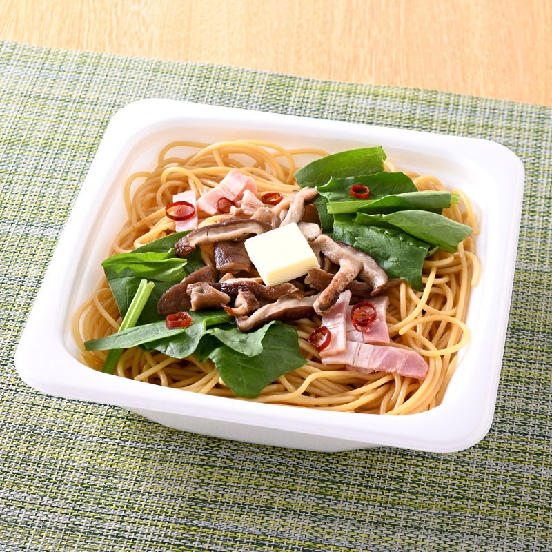 【内容】肉厚な福島県産「愛情しいたけ」に、ベーコン、ほうれん草などをトッピングしたバター醤油味のパスタです。しいたけの風味とバター醤油の香ばしさがマッチし、プリっとしたしいたけの食感も楽しめます。