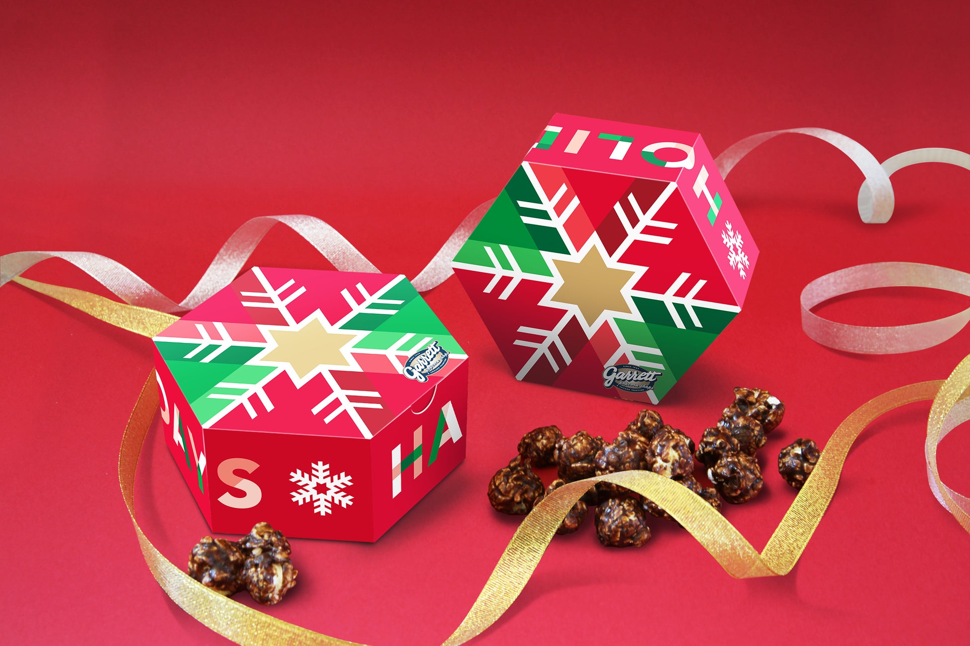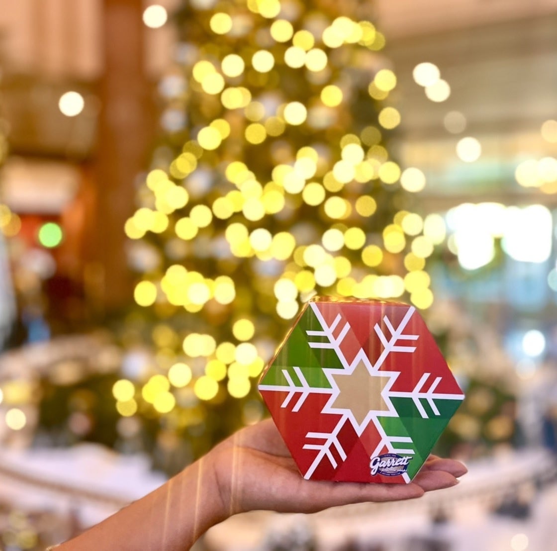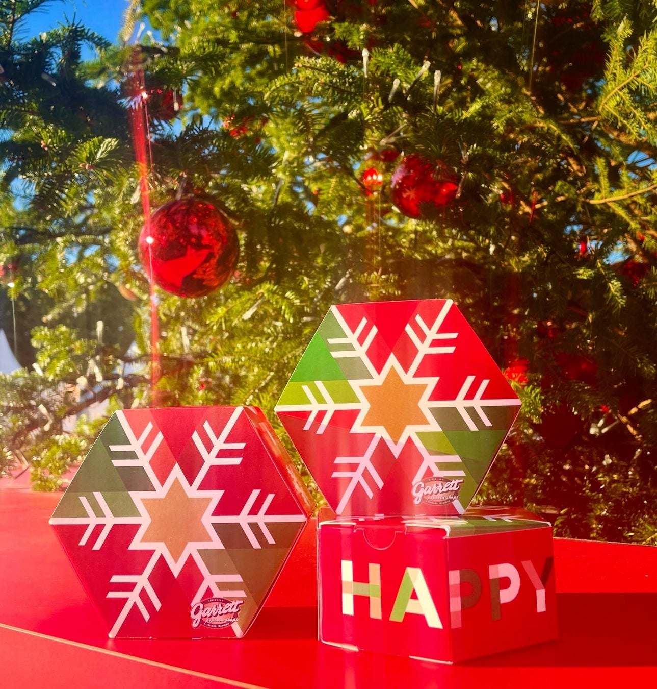 レッドとグリーンのクリスマスカラーを基調にしたスノーフレーク柄のBOXに「ココアキャラメルクリスプ™」を詰め込んだ『スノーフレークBOX』。手のひらにちょうど載るサイズ感はプチギフトにピッタリ。