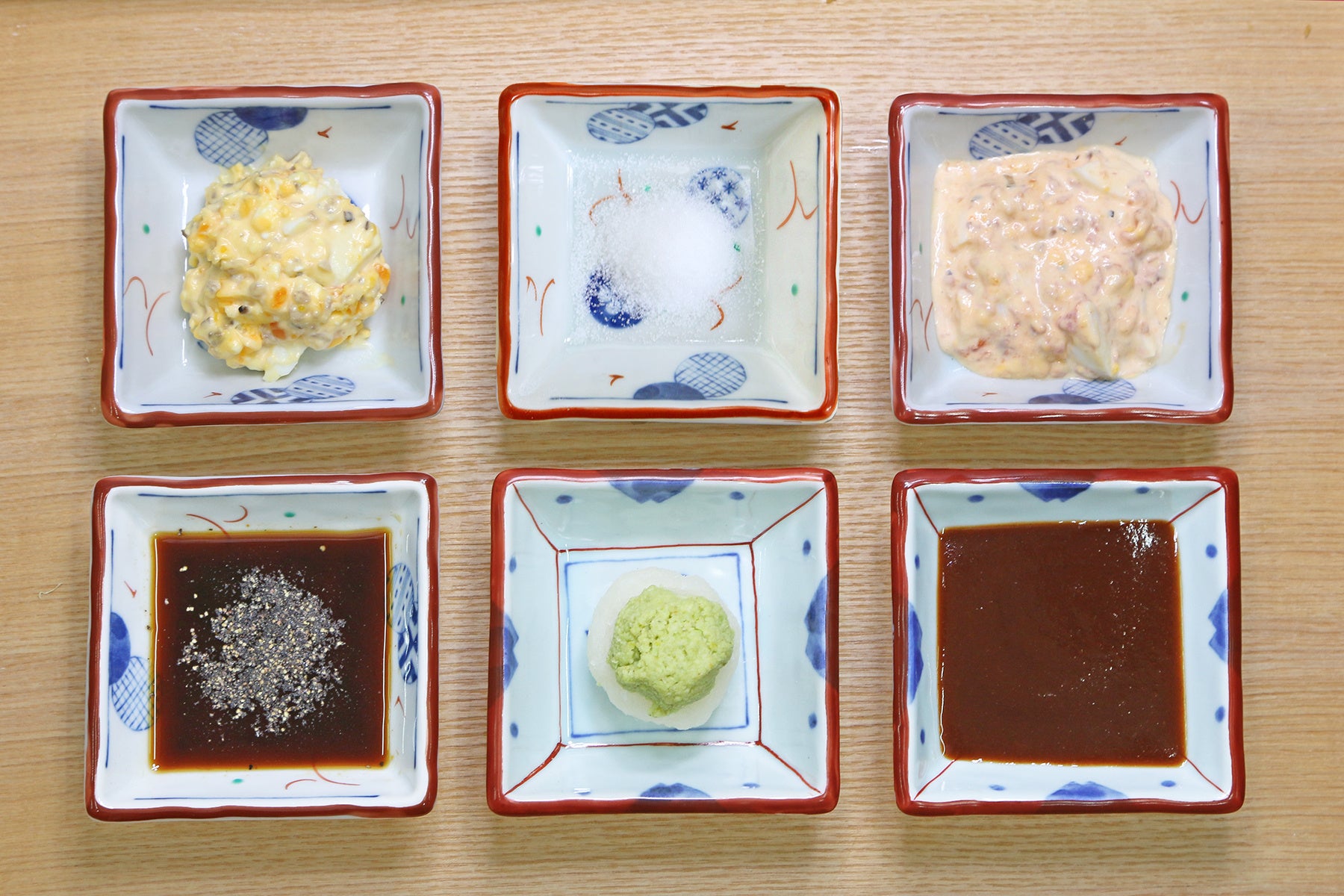 磯のやでは「ワサビおろし醤油」を推奨して通常お出ししますが、その他に「こだわり玉子のタルタルソース」「小田原梅のタルタルソース」「黒胡椒ソース」「磯のや特製ソース」「小田原柑橘塩」など、5種類のラインナップから調味料を一品お選びいただけます。