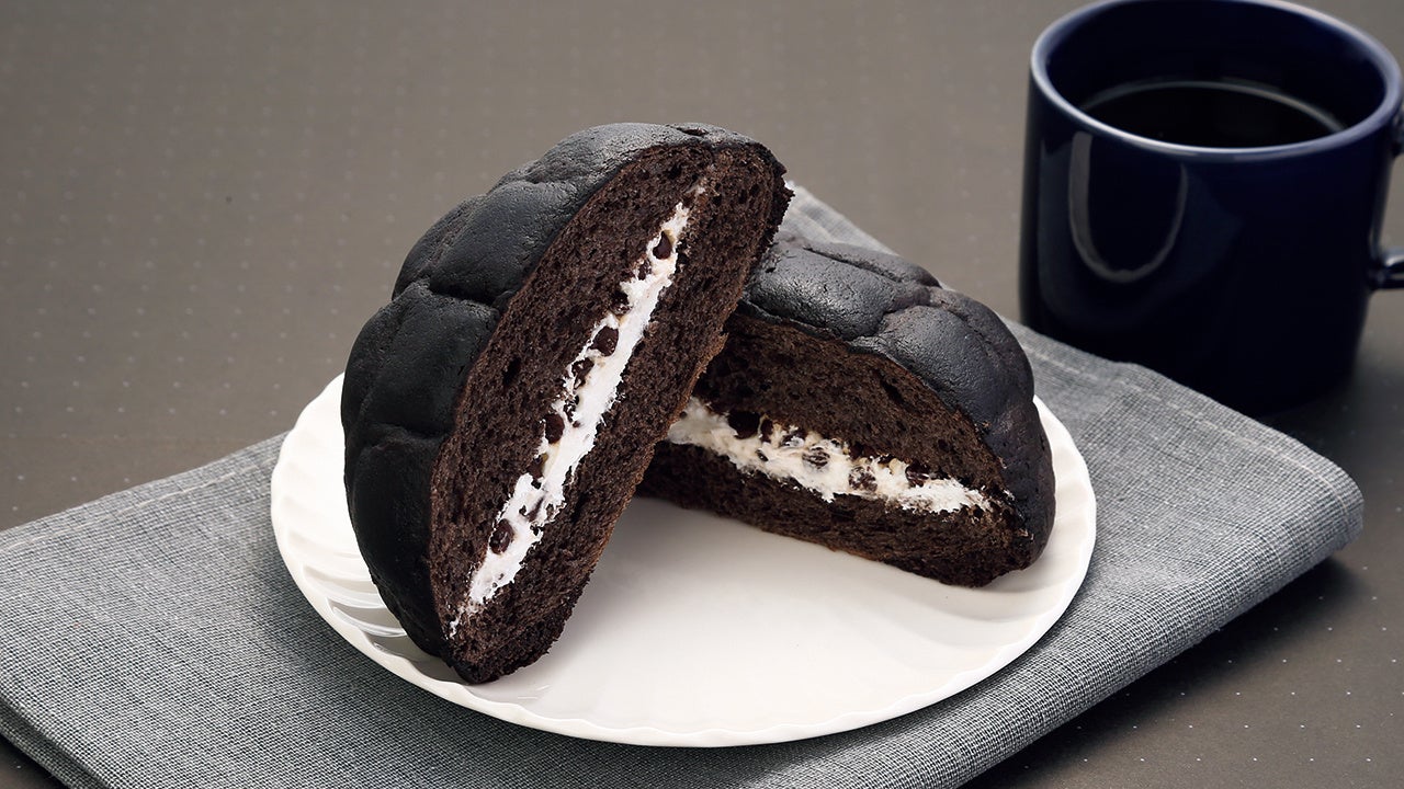 ブラックココアを入れて真っ黒に仕上げたメロンパンに、ホイップとチョコチップをサンドしました。