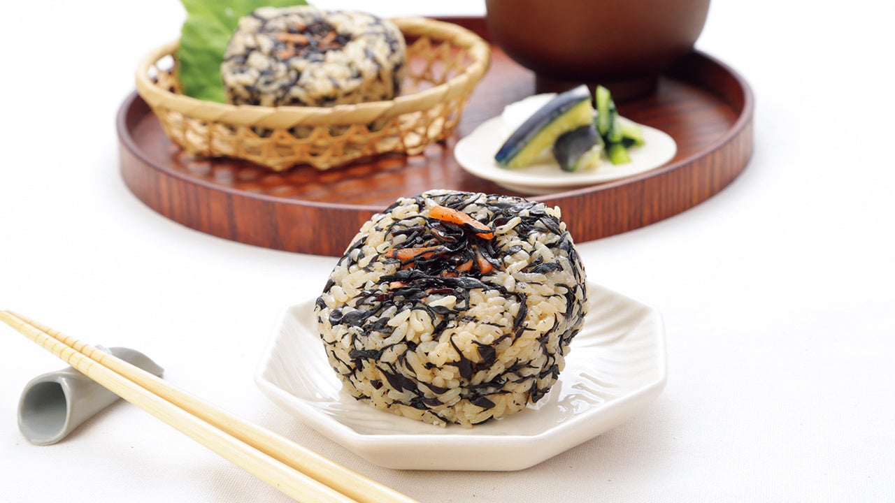 ひじきをたっぷりと混ぜ込んだひじきご飯をおにぎりにしました。仕上げとして、さらにひじき煮をトッピングして、黒いおにぎりにしました。