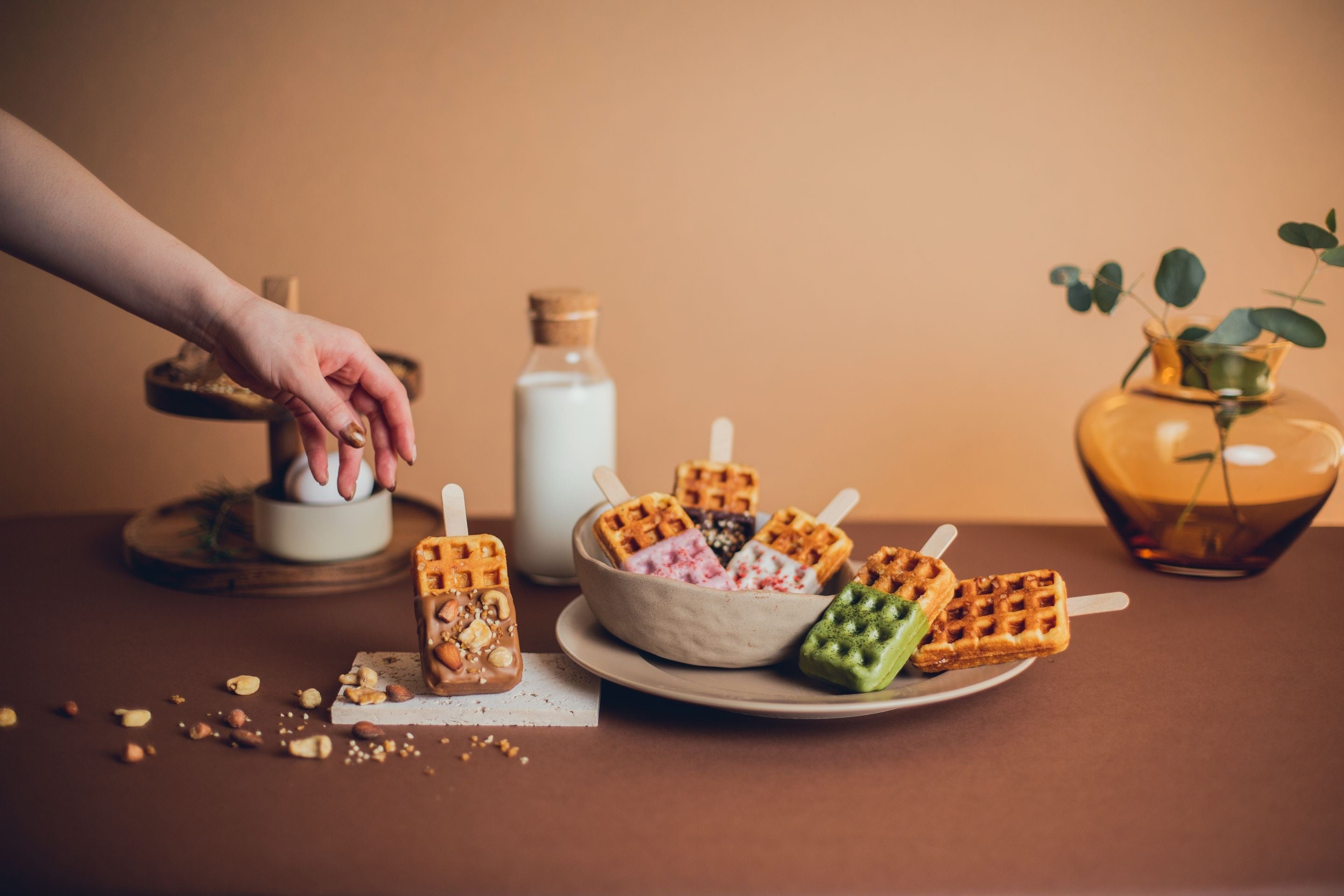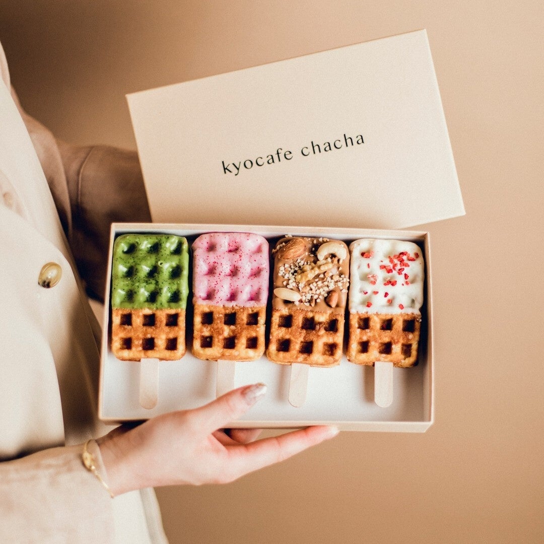 kyocafe chachaで販売している”京ワッフル”は、ワッフルにスティックが刺さったバータイプの新感覚ワッフルで、”ワンハンドスイーツ”や”新しい京都のお土産”としてTVやメディアで話題の商品。