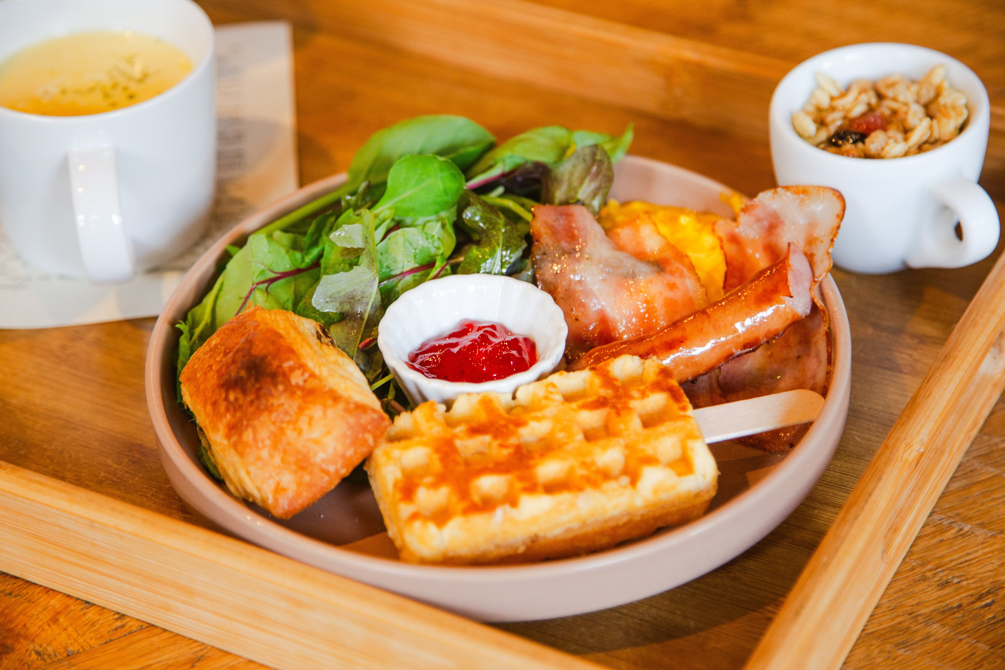 「kyocafe chacha」自慢の手作りワッフルや、京都の老舗パン屋「進々堂」のパンを味わえる、大満足の内容となっております。