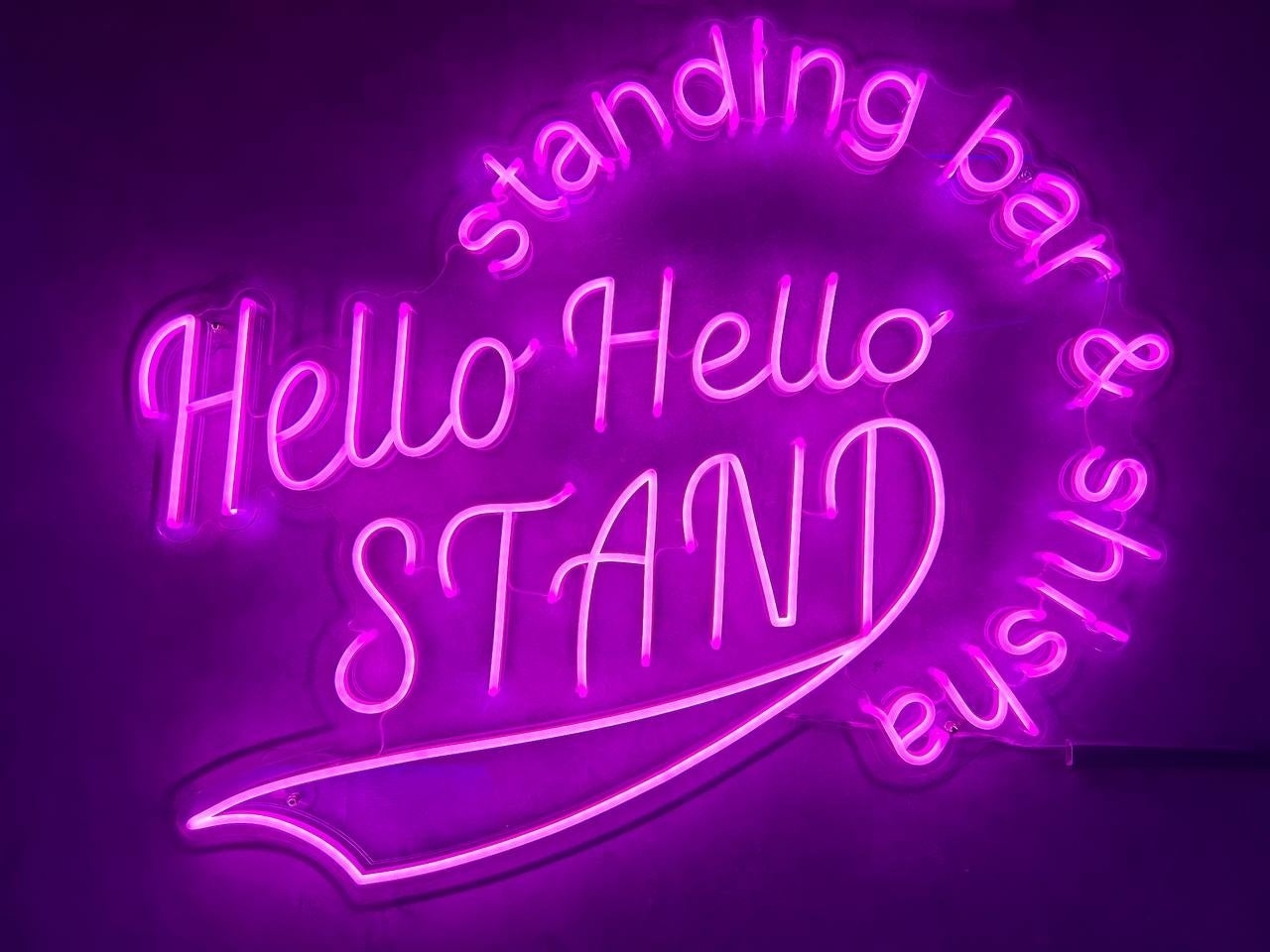 「Hello Hello STAND」は、“銀座の秘密基地”をコンセプトに、「お酒」「音楽」「シーシャ」を融合した特徴的なスタイルのスタンディング・シーシャバーです。お客様同士が出会い、繋がり、ご縁が広がることで日本を活性化させたいという想いから誕生しました。海外のスタンディングバーの様に気軽に「Say Hello」と言える明るい場になるよう、「Hello Hello STAND」という店名を採用しました。