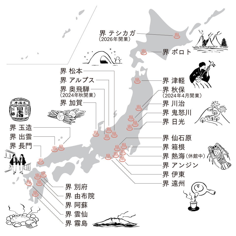 「界」は星野リゾートが全国22施設に展開する温泉旅館ブランドです。「王道なのに、あたらしい。」をテーマに、季節の移ろいや和の趣、伝統を生かしながら現代のニーズに合わせたおもてなしを追求しています。また、地域の伝統文化や工芸を体験する「ご当地楽(ごとうちがく)」、地域の文化に触れる客室「ご当地部屋」が特徴です。2024年4月には、宮城県・秋保温泉に「界 秋保」、秋には岐阜県・奥飛騨温泉郷に「界 奥飛騨」を新規開業します。