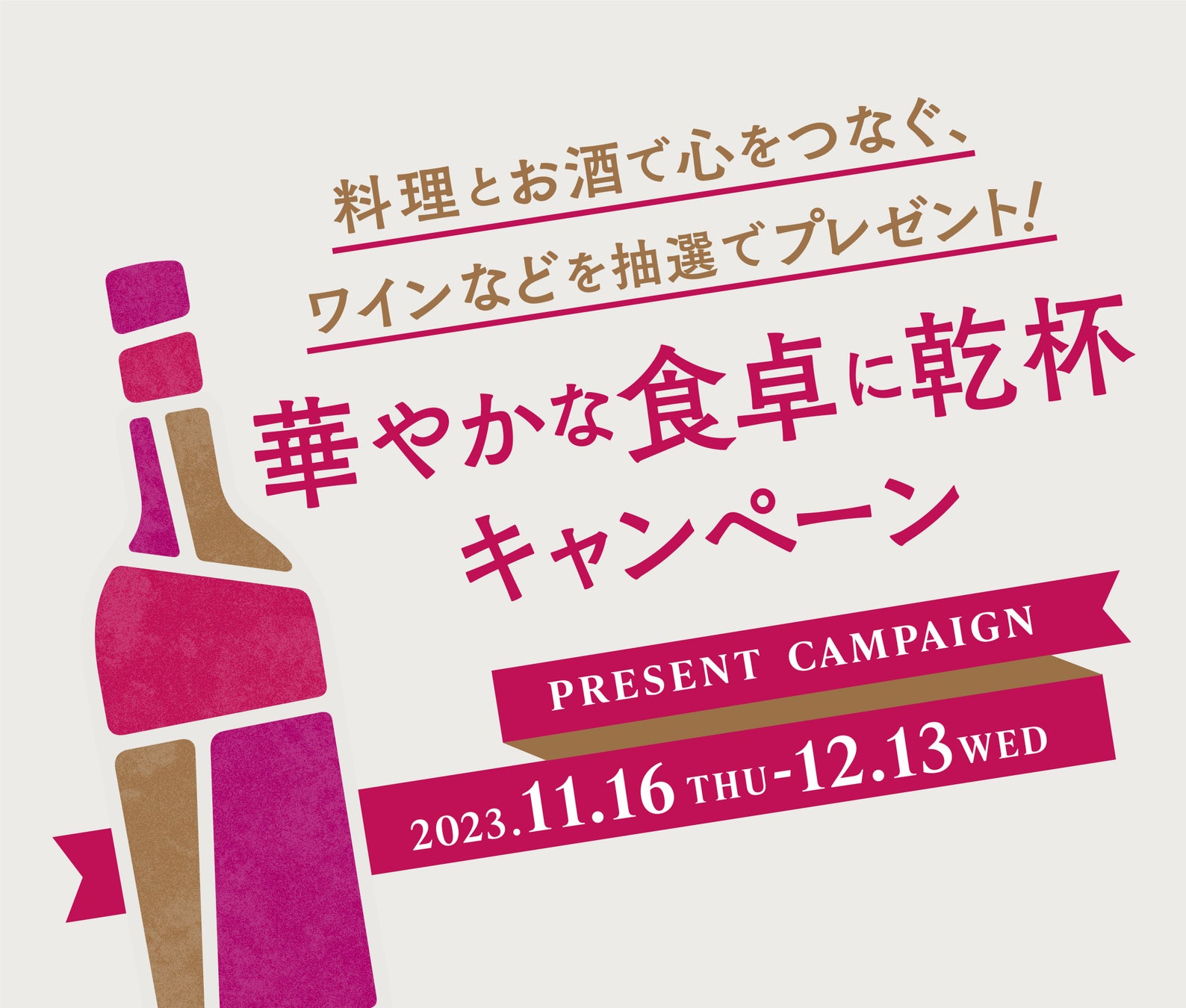 株式会社ロック・フィールド(代表取締役社長:古塚孝志、本社:神戸市)は11月16日(木)から12月13日(水)の28日間、ロック・フィールドメンバーズの公式アプリで、集いを楽しく盛り上げるワインや日本酒が抽選で合計210名様に当たる「華やかな食卓に乾杯キャンペーン」を開催いたします。期間中、エントリーフォームにて希望賞品を選択、アプリ利用可能店舗にて獲得したポイント合算60ファンポイントごとに応募1口として参加することができます。クリスマスや年末年始の食卓をもっと豊かに、華やかに過ごしていただきたいという想いを込めて企画いたしました。
