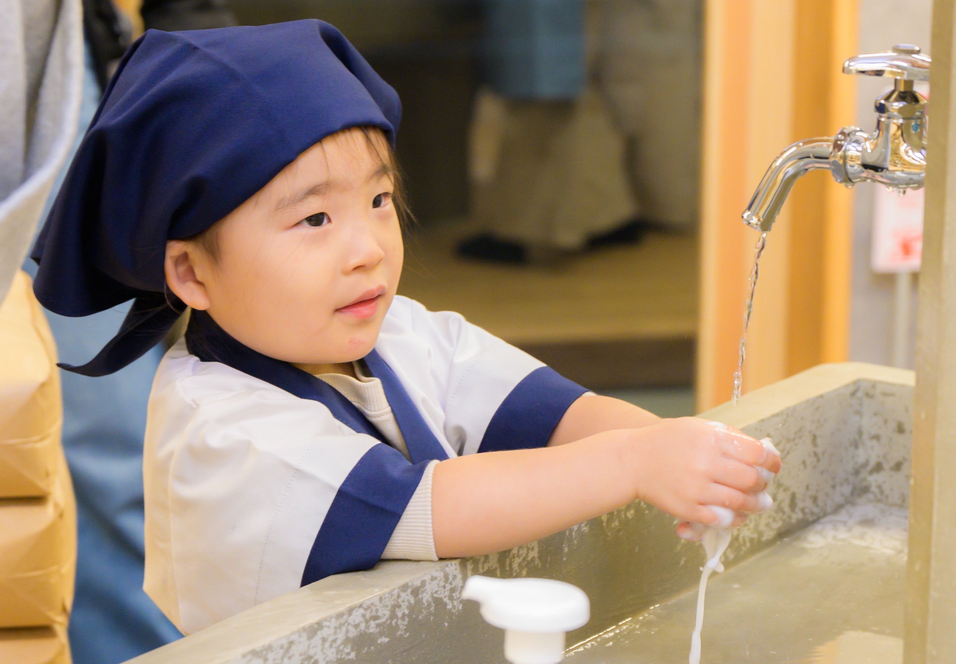 おいしく楽しく食べるには手洗いも大切!スタッフがしっかりお教えします。