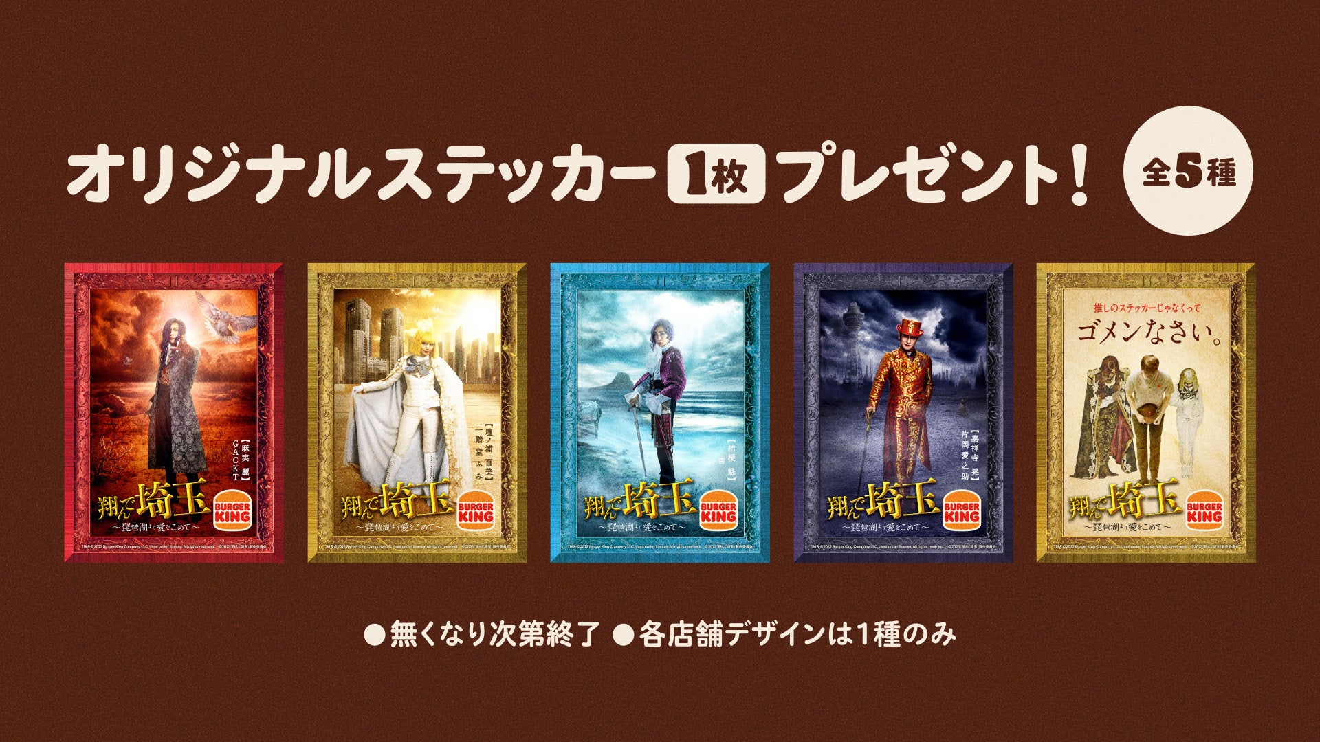 『翔んで埼玉 ワッパー® セット』を1つにつき、『翔んで埼玉』オリジナルステッカー(※全5種デザイン・1店舗1デザインでの配布※無くなり次第終了)が1枚付いています。