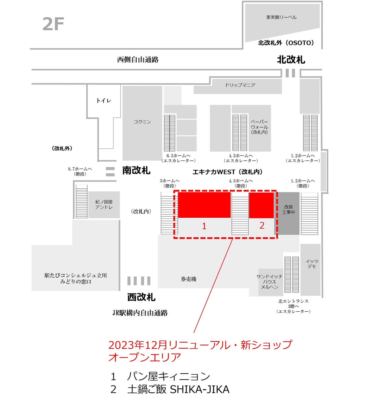 エキュート立川の改札内・エキナカWESTのベーカリー・飲食ショップが、2023年12月にリニューアルいたします。「DAILY SUPPORT」のゾーンコンセプトのもと、2007年のエキュート立川オープンよりお馴染みの「パン屋キィニョン」がリニューアルオープンするほか、「土鍋ご飯 SHIKA-JIKA」がニューオープンいたします。