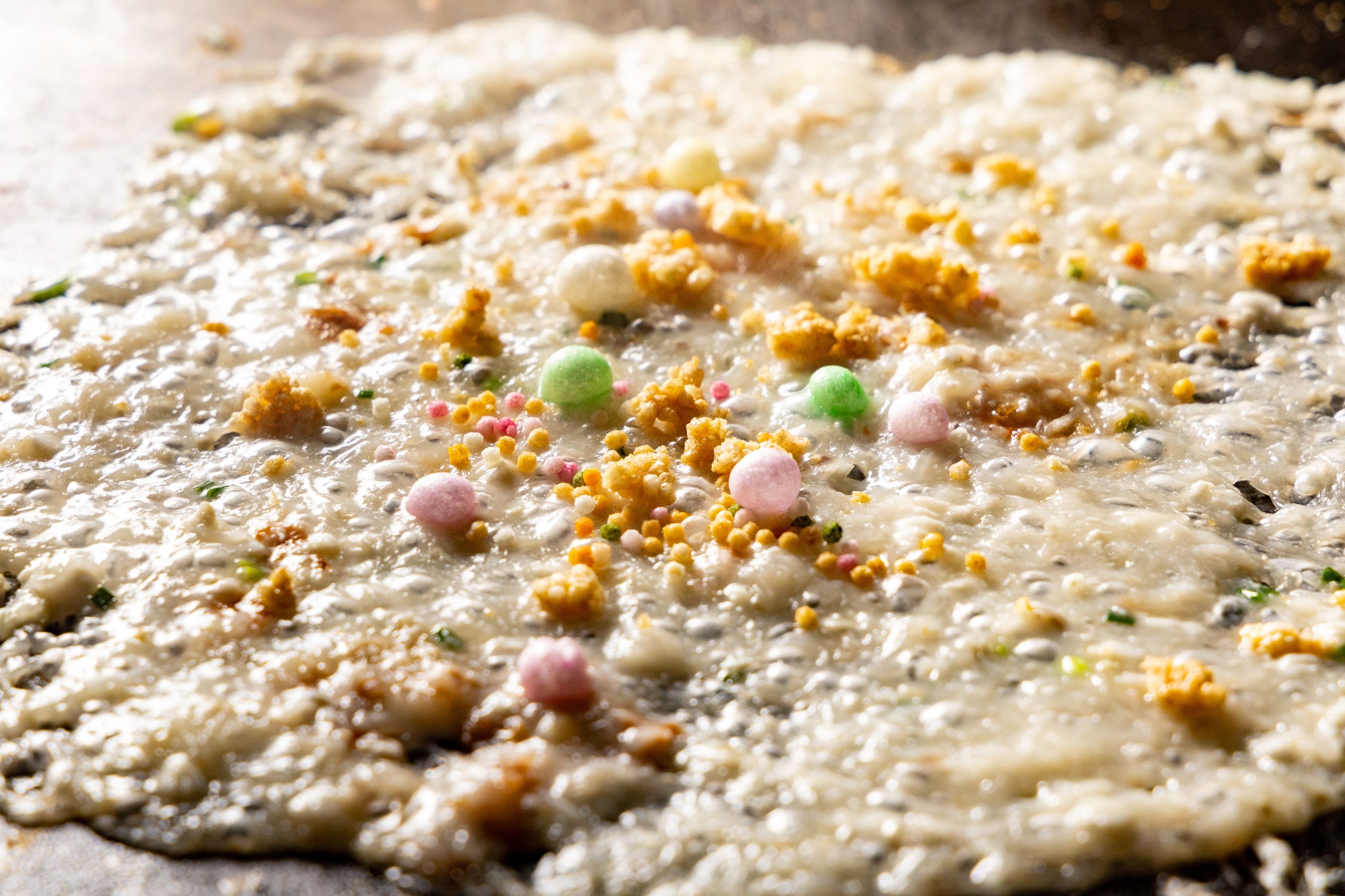 もち粉、豆腐、大根のつま、お餅をベースとする「餅もんじゃ」の一番の味わいは【おこげ】にあり。おこげを最大限に楽しんで頂きたいので、極力薄く、広く伸ばして、おこげを味わっていただきます。