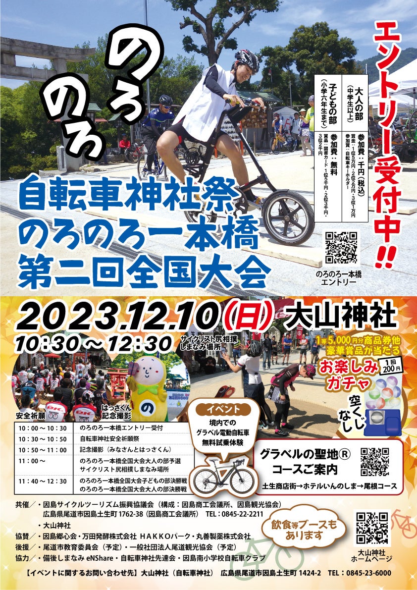 因島サイクルツーリズム振興協議会(構成:因島商工会議所、因島観光協会等)と大山神社共催で、「自転車神社祭・のろのろ一本橋第2回全国大会」を12月10日(日)に大山神社(広島県尾道市因島)にて開催します。