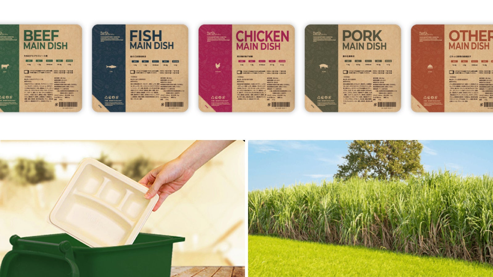 当社のお弁当容器は冷凍宅配食サービスには珍しい「パルプモールド」素材を採用しています。パルプモールドは環境問題に対して様々な分野で期待されている素材です。主な原材料はサトウキビ搾汁後の粉で、燃やしても有害な物質は発生せず、もし放置されても土壌で分解され自然に還るので、自然環境に負荷がかかりません。仮に体内に入ったとしても健康被害が少ないのが特徴です。