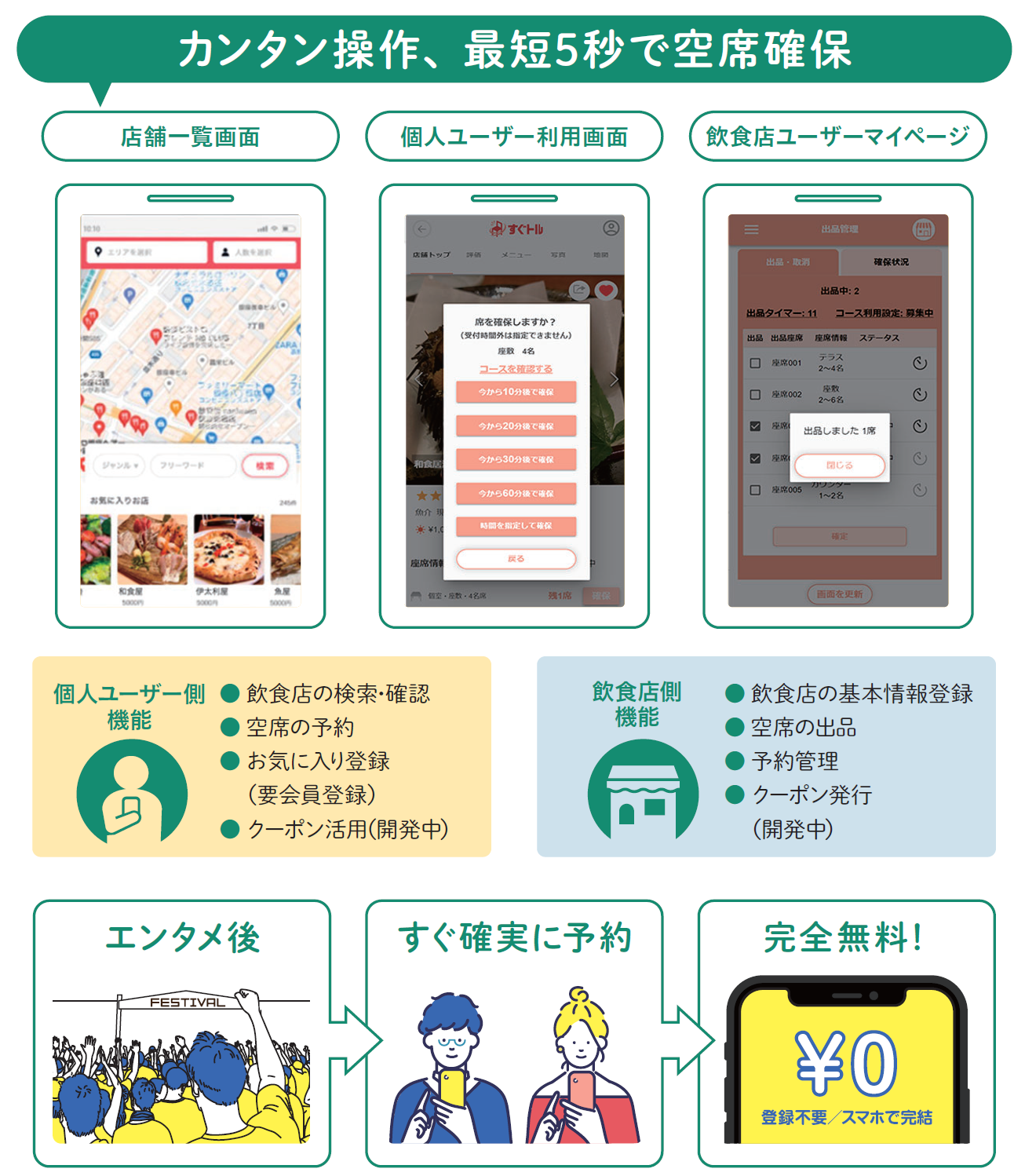 スマホのみで最短5秒、ライブ会場周辺のお店の席が予約できるWEBサービス「すぐトル横浜」です。