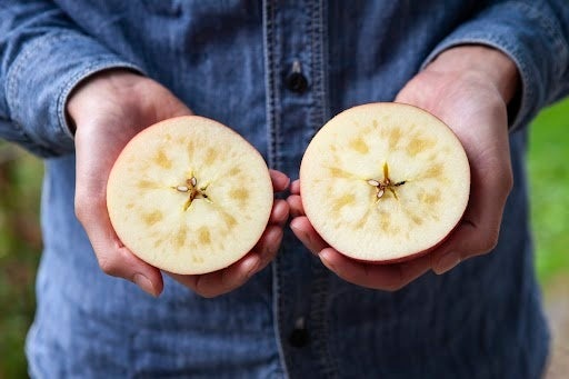 表面に凹凸のあるりんごは、「いぼり りんご」と呼ばれます。色の薄い筋が入り、荒々しく野性的な外見は、たくさんの養分を蓄えた証。一本の木から僅かしか収穫できない貴重な実には、りんご本来の甘味と果汁が凝縮っされています。