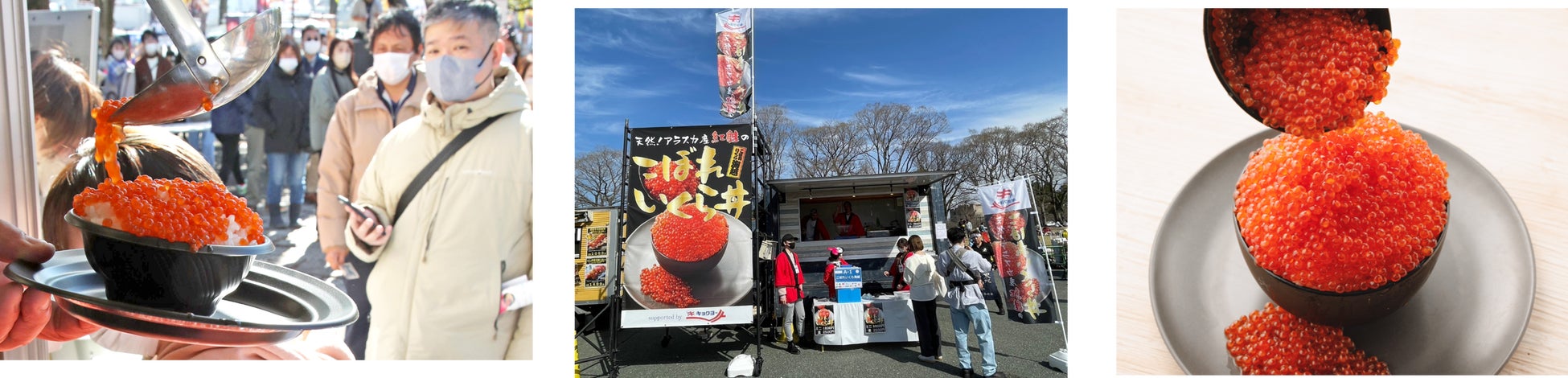 「アラスカシーフードマーケティング協会&極洋」ブースでは、フェスで1番人気を争う名物メニュー「天然!アラスカ産紅鮭のこぼれいくら丼」を提供します。100%天然のおいしさを誇り、サステイナブル(持続可能)な漁業によって漁獲されたアラスカ産の紅鮭いくらをご用意。〝紅子〟ともいわれる紅鮭のイクラは、ルビーのような色合いで、コクのある味わいととろけるような食感が特徴。これまで卵をバラバラにほぐして、いくらに加工することは難しかったものの、極洋が長年の魚卵加工で培ったノウハウに基づき、試行錯誤を重ね、おいしい紅鮭イクラの商品化にこぎつけました。丼から下皿に豪快にイクラがこぼれ落ちるパフォーマンスとともに、お楽しみください。